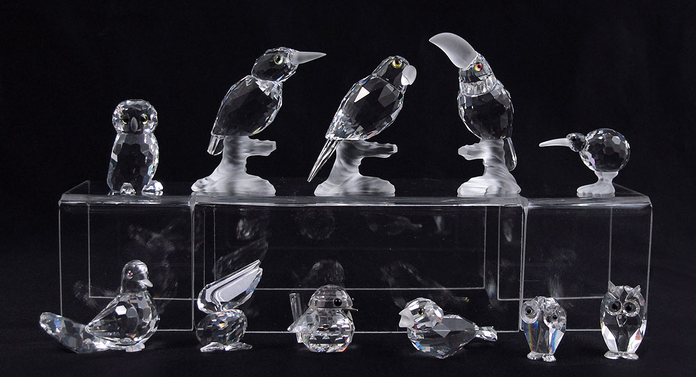 SWAROVSKI CRYSTAL BIRD FIGURINES: 11 pieces to include, DOVE 7605, E. Mair, issued 1995 retired 2005; KINGFISHER 7621, M. Stamey, issued 1990 retired 1992; KIWI 7617, M. Stamey, issued 1991 retired 1996; PELICAN 7679, A. Hirzinger, issued 1993 retired 2002; PARROT 7621, M. Stamey, issued 1989 retired 1992; TOUCAN 7621, Michael Stamey, issued 1989 retired 1992; OWLET 7636, Anton Hirzinger, issued 1995 retired 2000; MINI OWL 7654, Max Schreck, issued 1979; tiny owl not marked Swarovski; MINI SPARROW 7650, Max Schreck, issued 1979 retired 1991; SPARROW 7650, Claudia Schneiderbauer, issued 1992 retired 1997.
