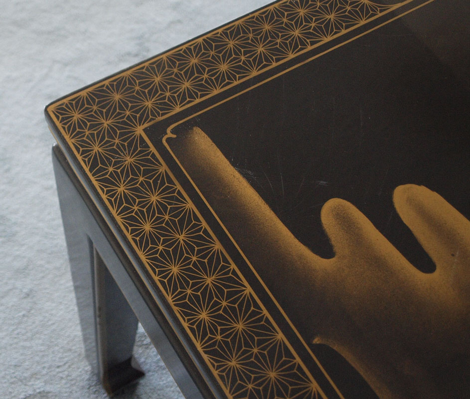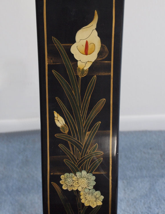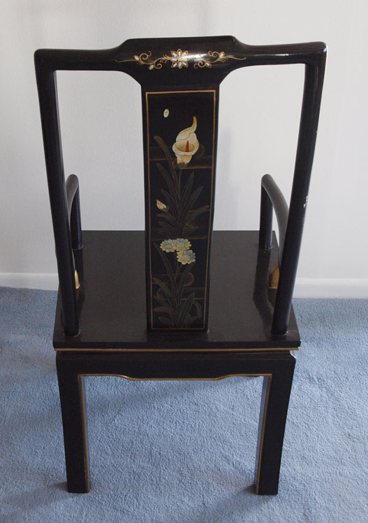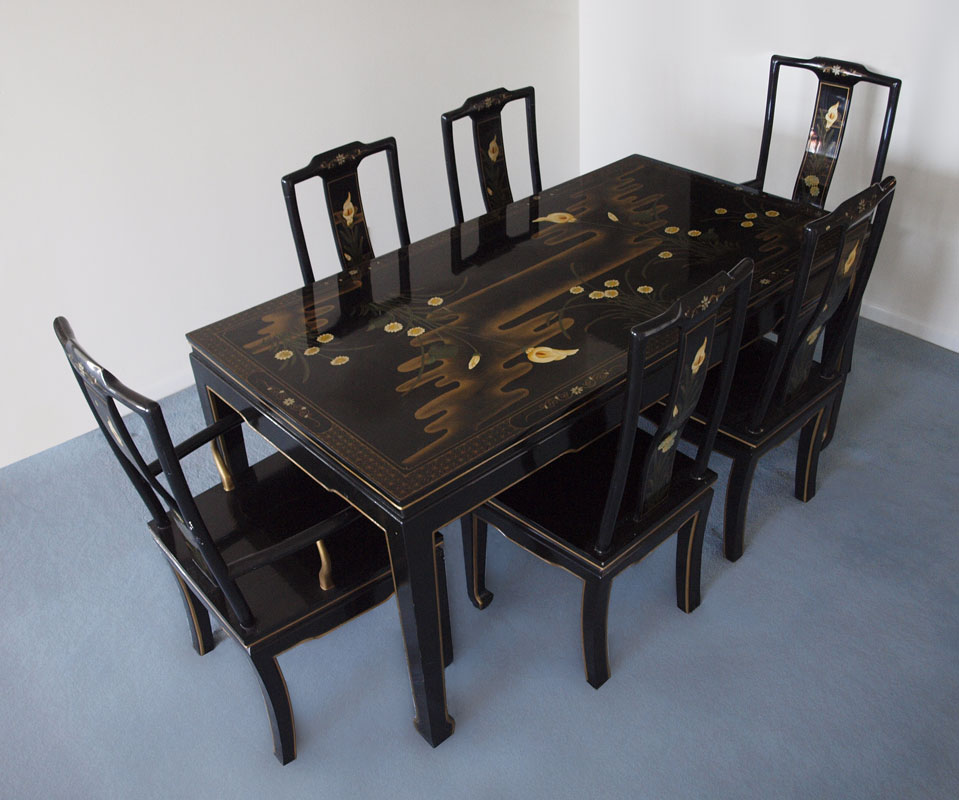 BLACK LACQUER CHINESE DINING TABLE WITH 6 CHAIRS: Chinese pond scene top table with glass, 30'' h. x 64'' x 34''. Matching 2 arm and 4 side chairs, arm chair 40 1/2'' h. x 20'' x 20''.