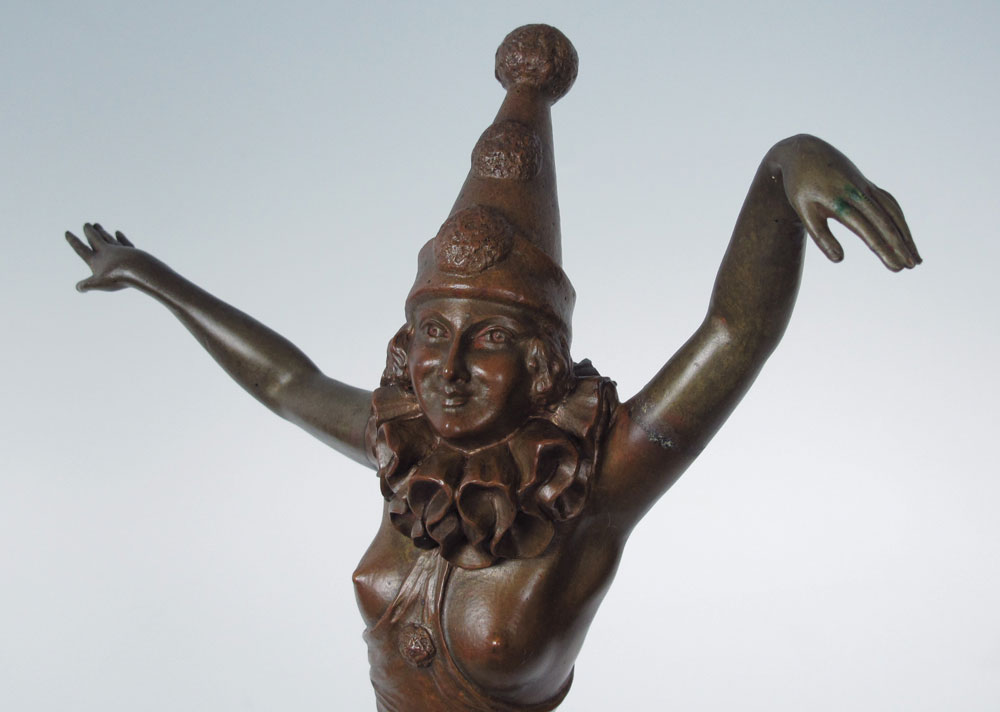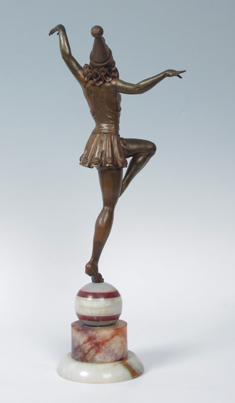 FEMALE HARLEQUIN NUDE DANCER BRONZE: 15''h, 19 1/2'' overall including onyx and marble shaped plinth, no visible signature circa 1930 in the style of Lorenzl.