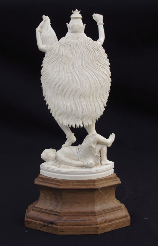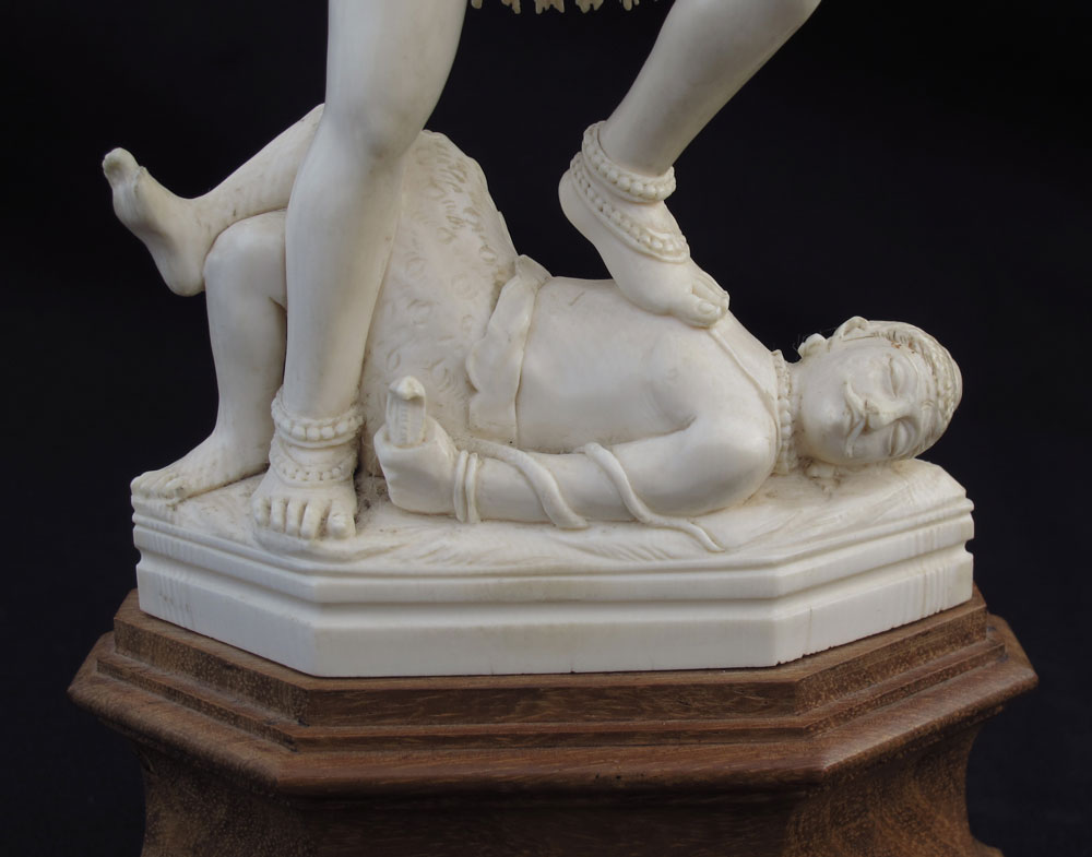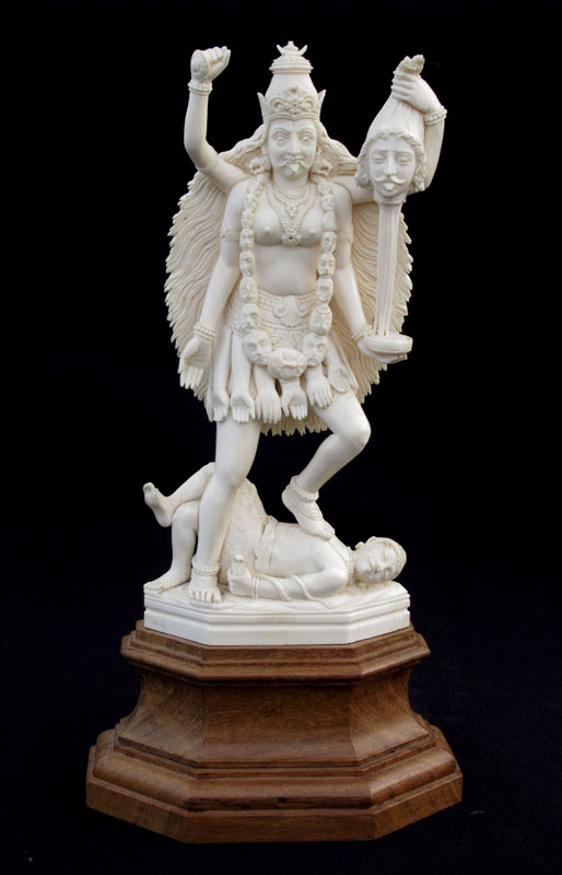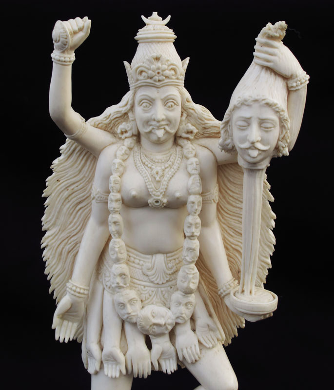 CARVED IVORY DEPICTING HINDU GODDESS KALI: Symbolizing the link between destruction and restoration in nature. Detailed carving of the dripping head, skull necklace and long flowing hair and skirt of hands. The ivory is 8'' tall. Attached to wood base. 10 1/2'' overall.