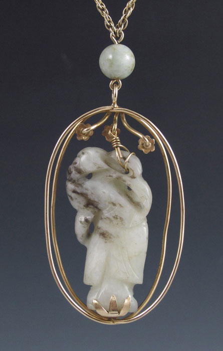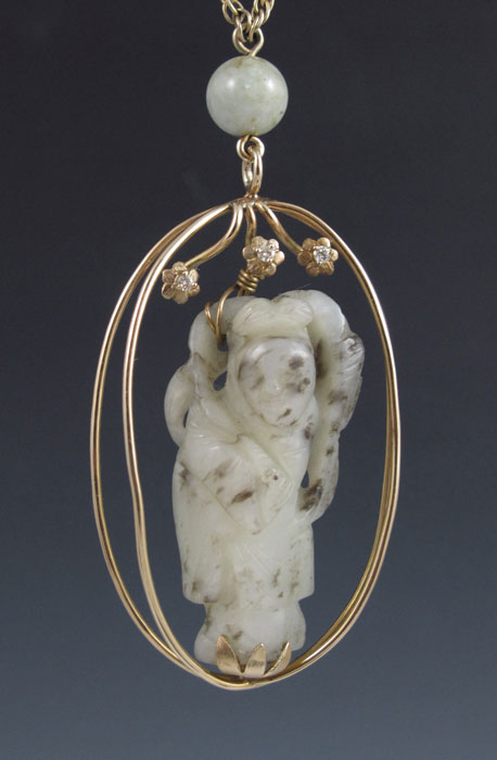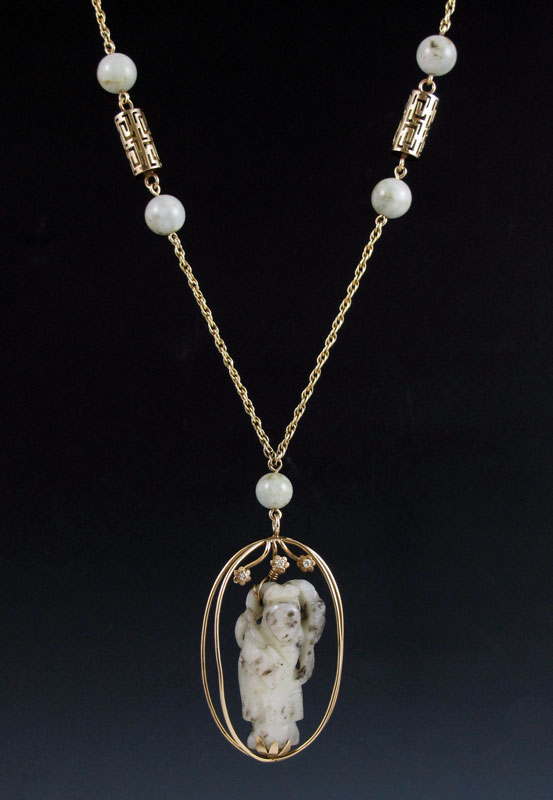 14K GOLD AND CARVED JADE NECKLACE: 14K yellow gold pendant featuring an antique carved mutton fat jade Quan Yin mounted in two gold oval hoops, and surmounted by three round full cut diamonds, approx. .10Ct. The 2.5'' pendant hangs from a 30'' 14K gold chain with jade beads and reticulated gold cylinder beads. Gross weight 53.6 grams.
