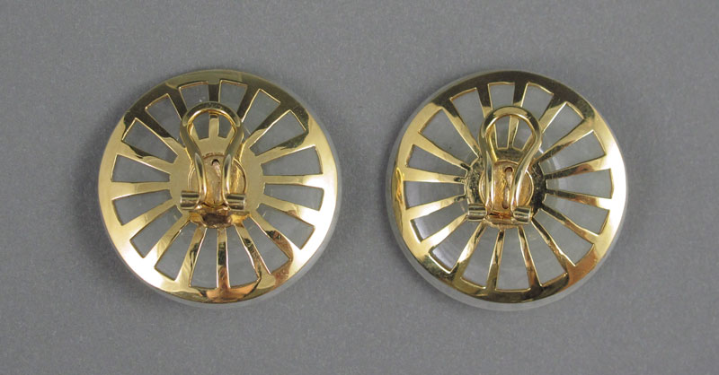 14K GOLD JADEITE JADE AND DIAMOND EARRINGS: Disc of polished jadeite centering two round full cut diamonds, approx. .04 Ctw. Earrings measure 1.25'' dia. Clip closure.