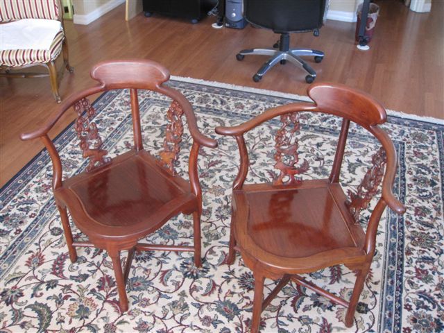 PAIR CHINESE CARVED ARM CHAIRS: Open carved backsplats, top rail curves around to form the arms.