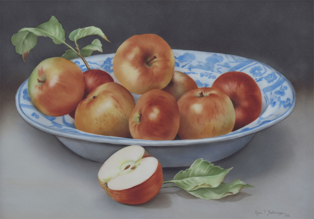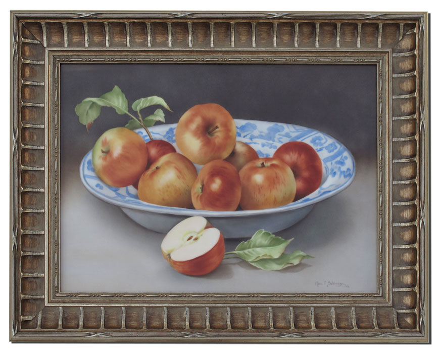 SALDARRIAGA, Maria, (American 20th C): Still Life of Apples in a Bowl, Painting on Porcelain, sight size 9 1/2'' x 13'', signed lower right, dated '04, framed, 14'' x 17 1/2''.