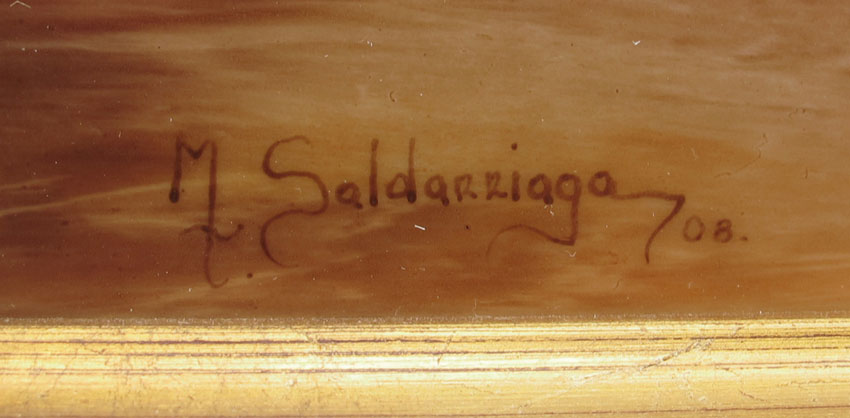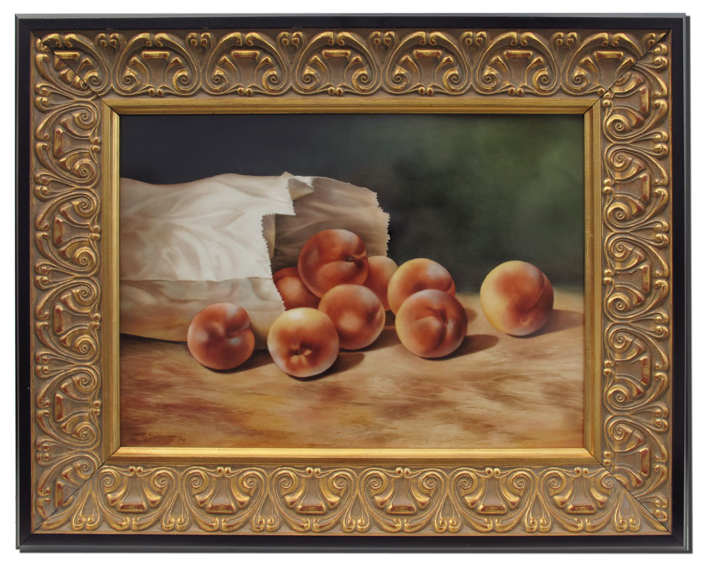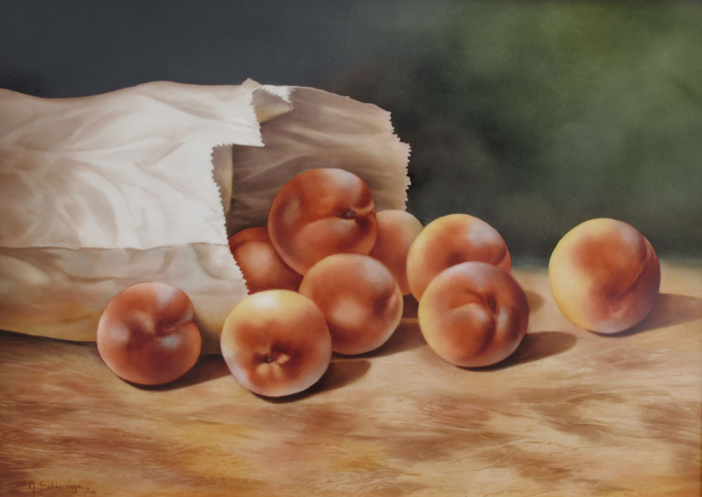 SALDARRIAGA, Maria, (American 20th C): Still Life of Peaches in a Bag, Painting on Porcelain, sight size 9 1/2'' x 13 1/2'', signed lower left, dated '08, framed, 15 1/4'' x 19''.