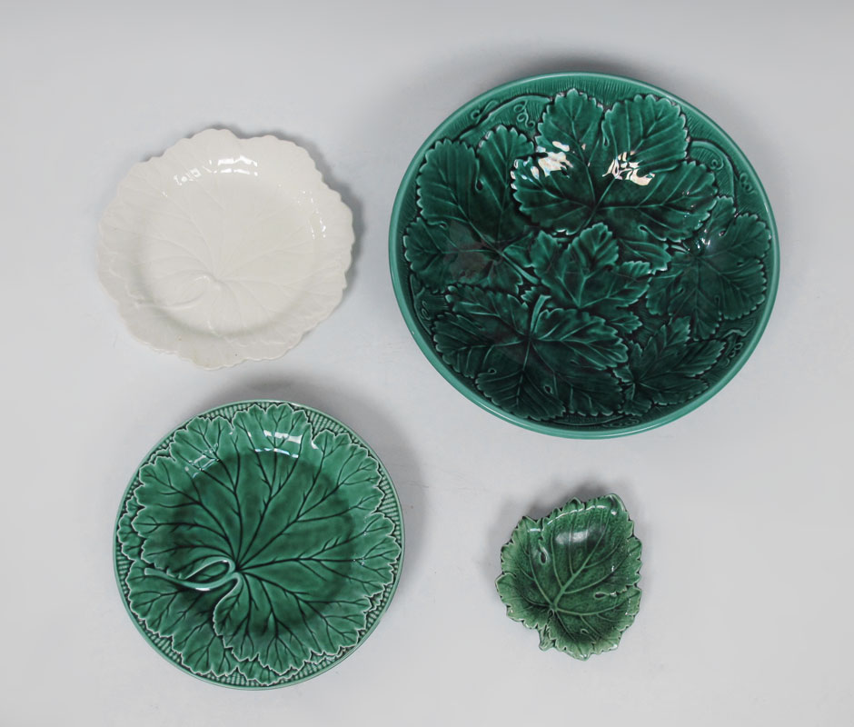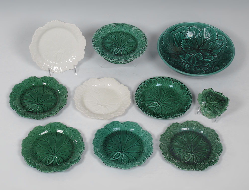 WEDGWOOD MAJOLICA LEAF PLATES AND BOWL: 10 piece group to include 11'' salad bowl, an 8'' pedestal dish, 7 plates, 8'' dia. and a small leaf nut dish, 4 1/2''.