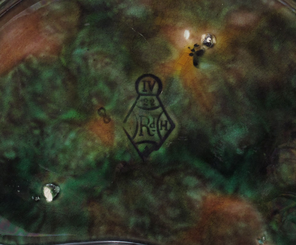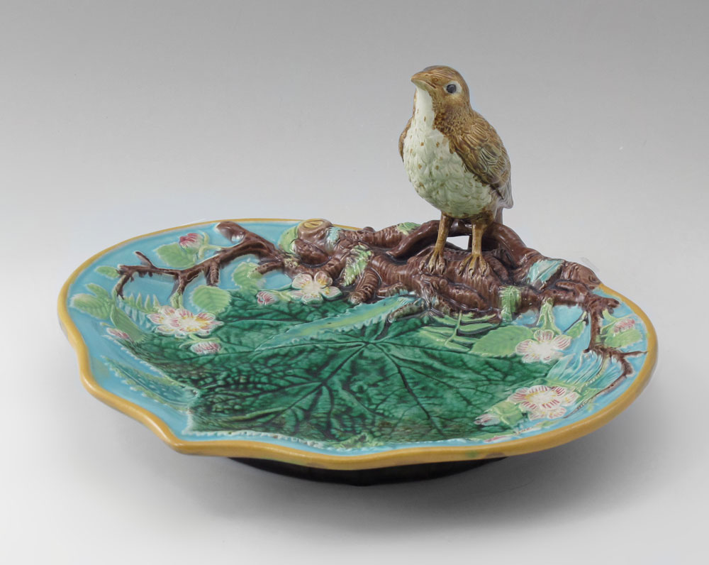 MAJOLICA GEORGE JONES SERVING TRAY WITH BIRD: Naturalistic bird perched on branches above a leaf that appears to be floating on the turquoise ground. 5 1/2'' tall x 9'' x 10''.