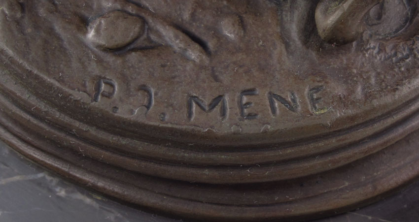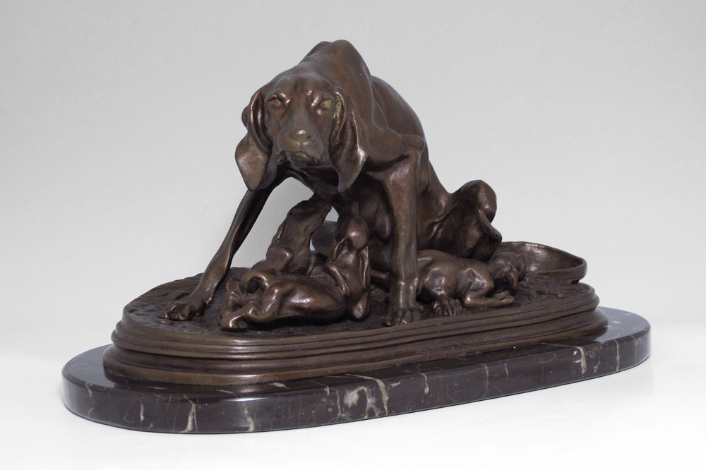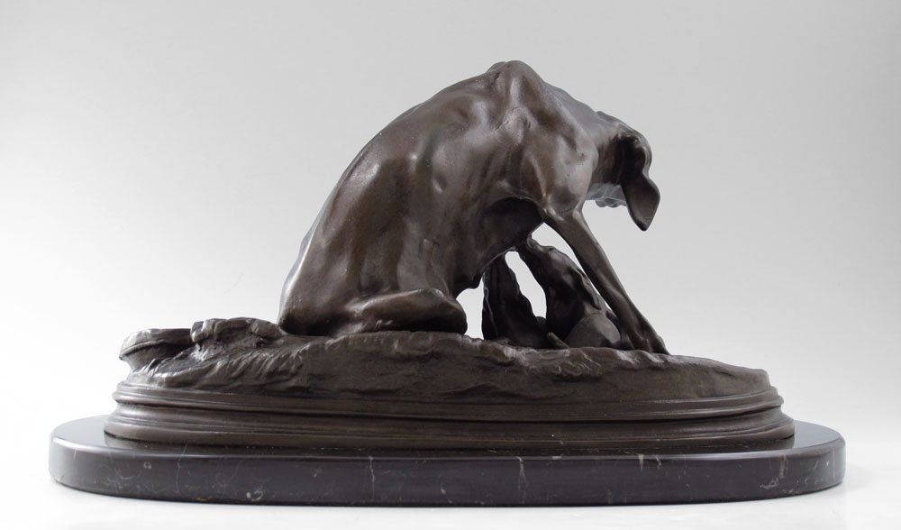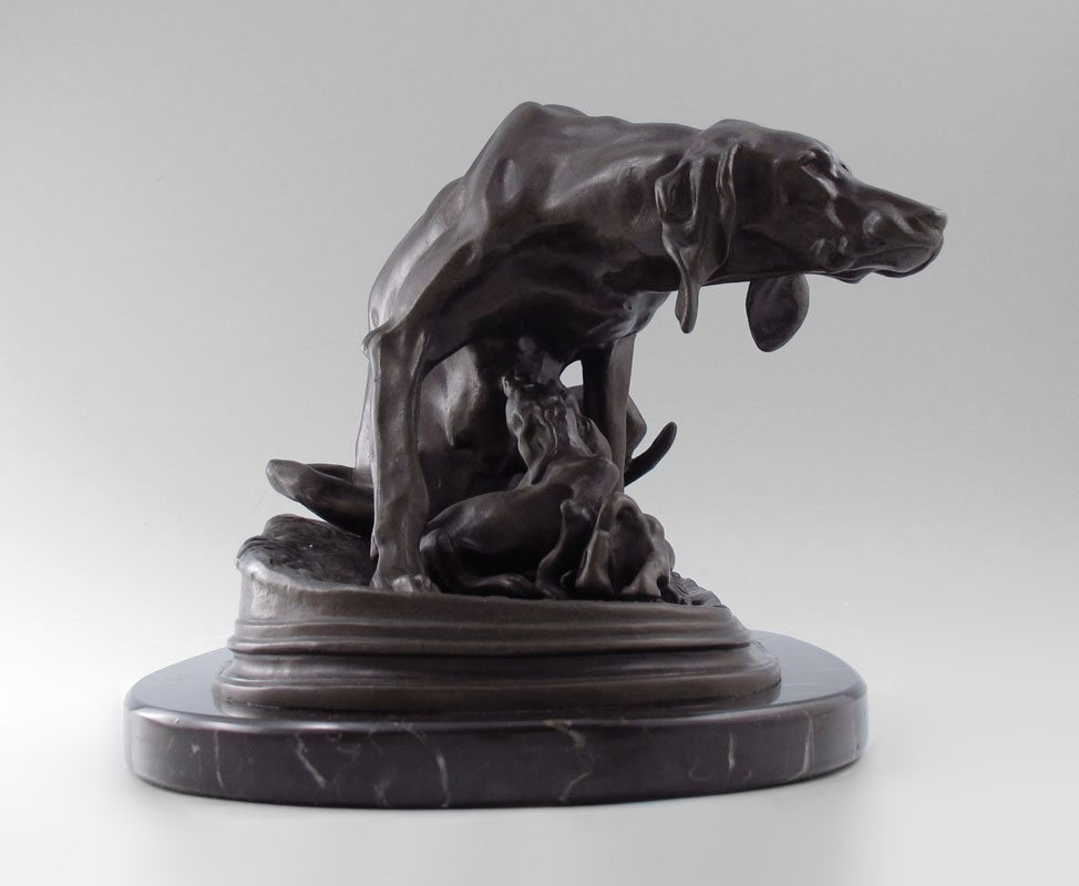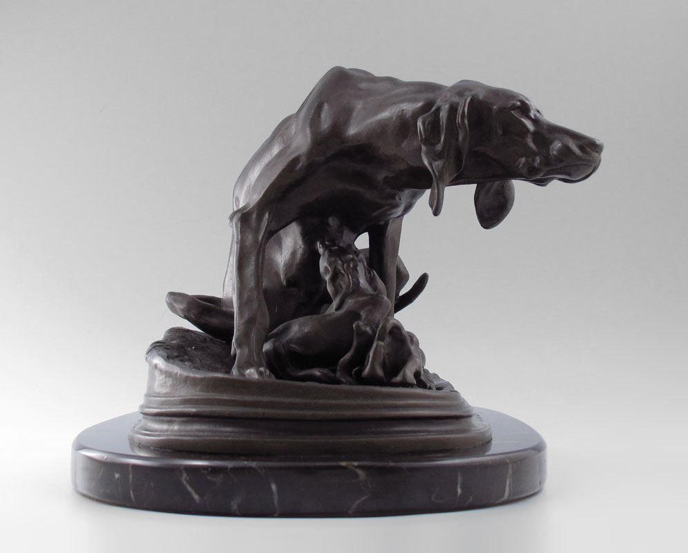 MENE, Pierre Jules, (French, 1810-1879): Bronze group of Saintongeois Pointer Bitch and Her Pups, 7'' h x 13'' w, incised signature affixed to vintage marble plinth, 8'' h x 15'' w.