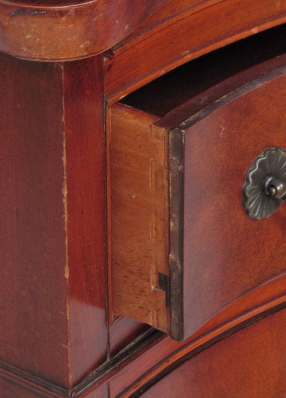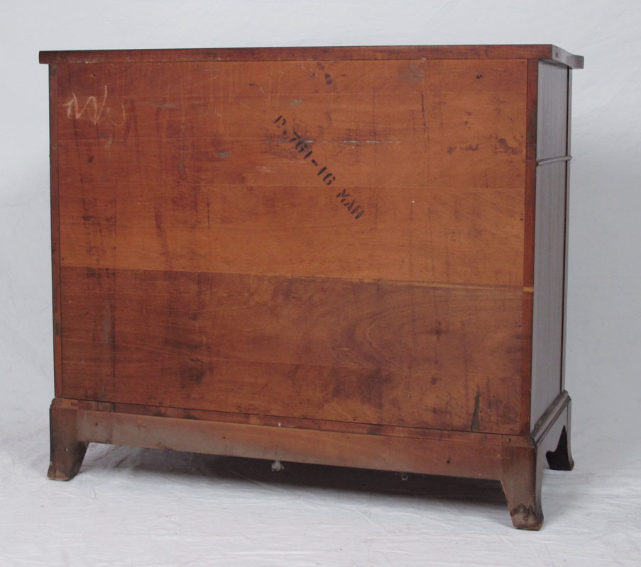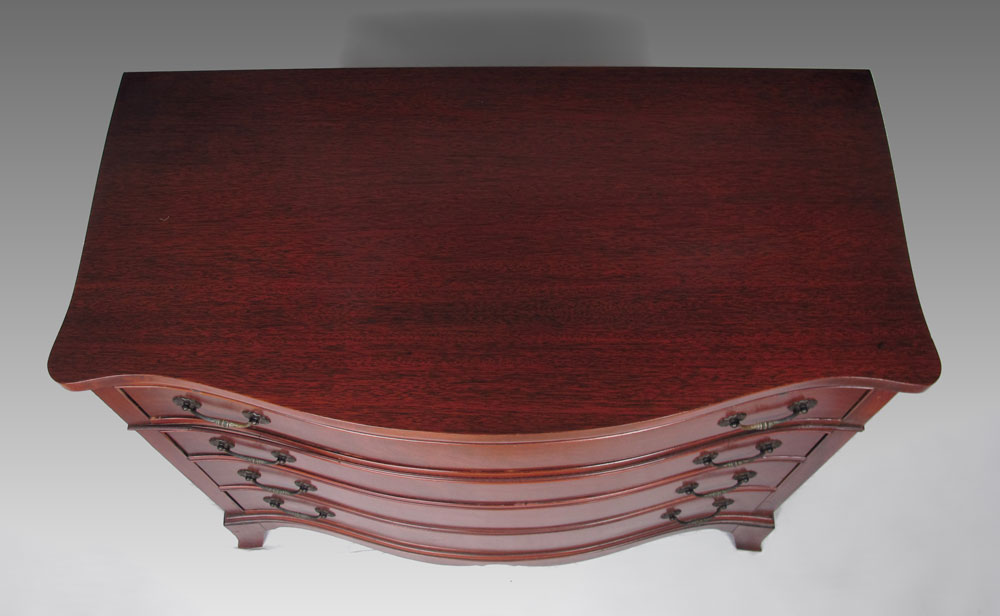 HEPPLEWHITE STYLE SERPENTINE FRONT CHEST OF DRAWERS: Mahogany. For drawers and slide. Approx. 33'h. x 19'' x 35''.