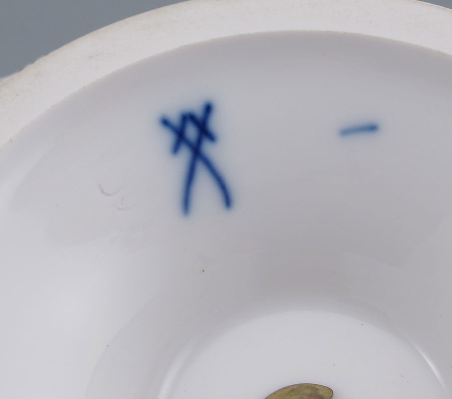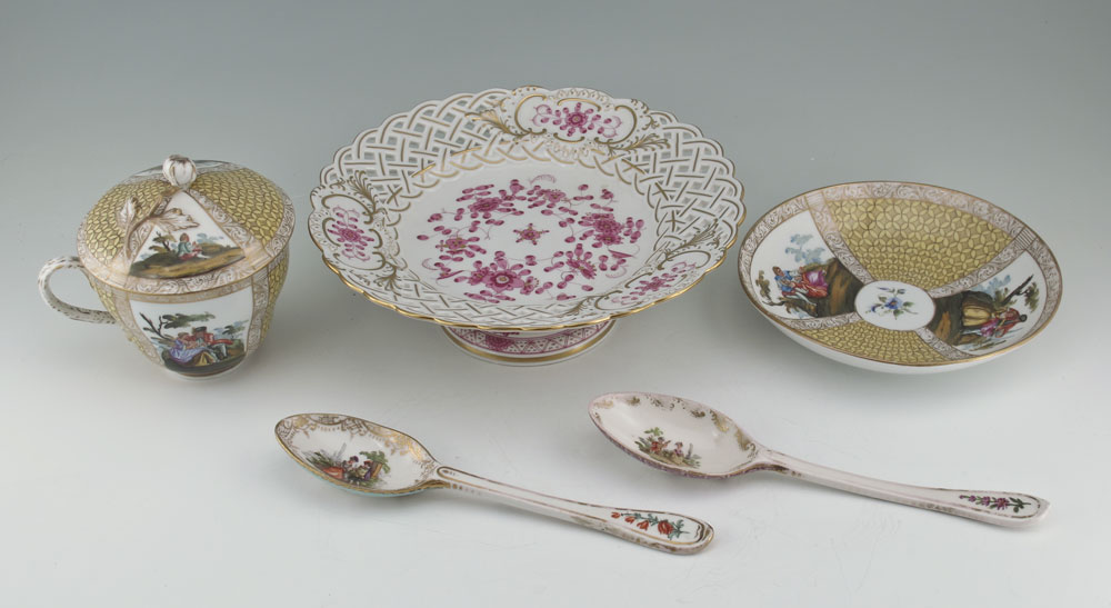 GROUP OF MEISSEN PORCELAIN: Reticulated center bowl, 8'' dia. 3'' tall. Two porcelain serving spoons, 8'' length. Covered cup and saucer with flower finial and panels of romantic scenes. All marked with the blue cross swords under glaze.