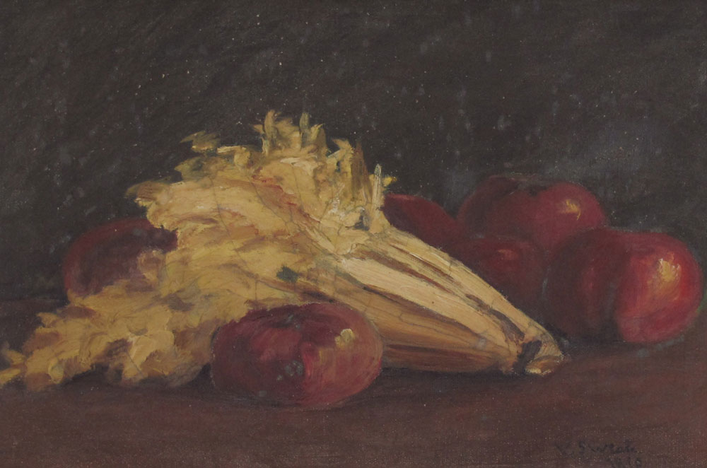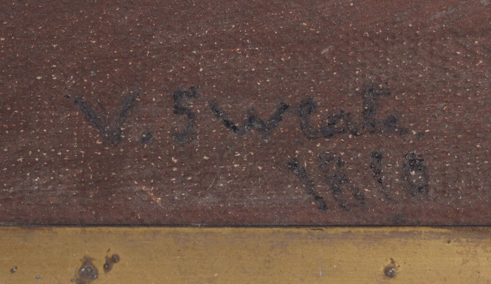 ILLEGIBLY SIGNED 19TH C. STILL LIFE: Onion, Celery, and Tomatoes, Oil/Canvas, 12'' x 18'', signed lower right V. Sweats? and dated 1890?, period gilded frame with wear, 17 1/2'' x 23 1/2''.
