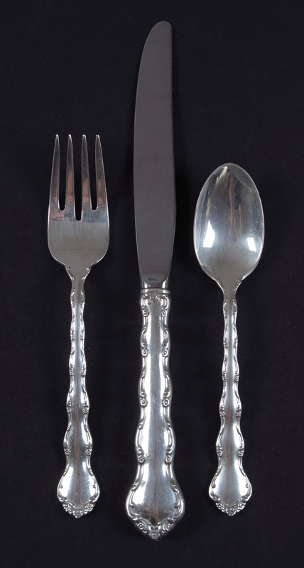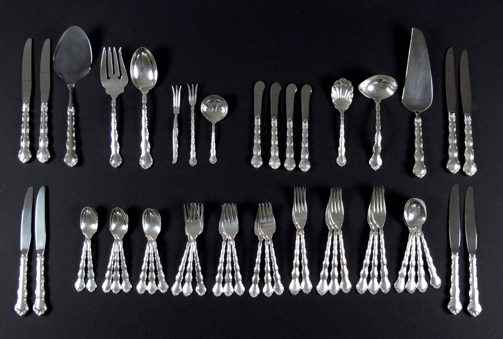 CONDITION: Note scratches and signs of use on flatware, scratches to silver chest.
