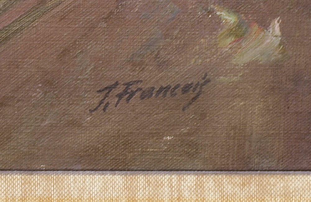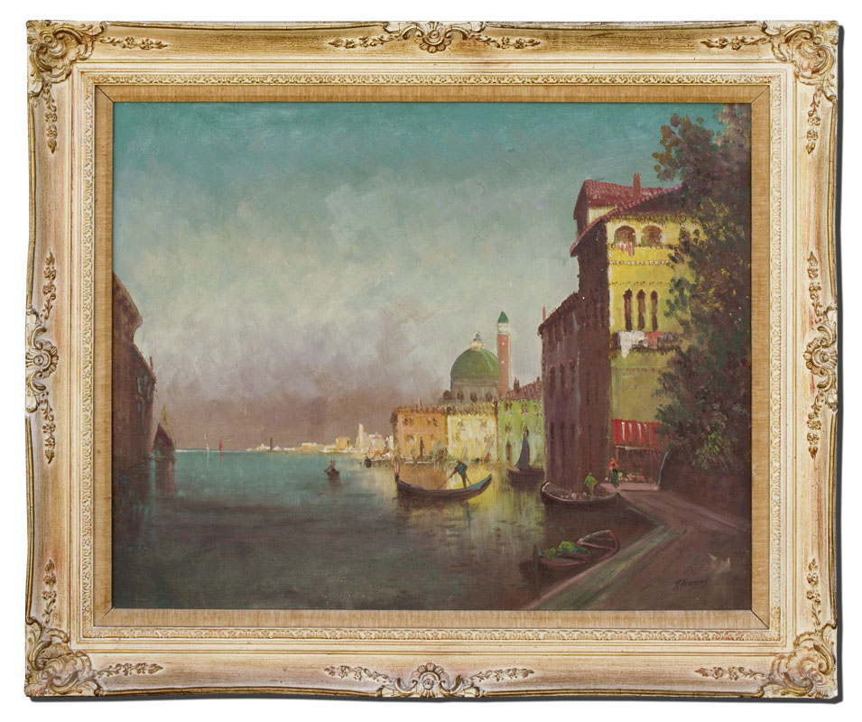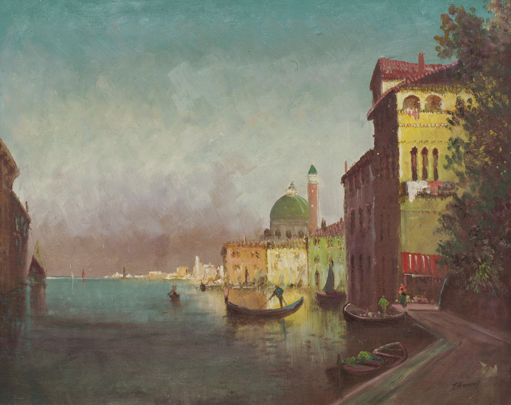 LARGE VENETIAN CANAL SCENE SIGNED J. FRANCOIS: Oil/Canvas, 24'' x 30'', signed lower right, carved and painted frame with wear, 30 1/2'' x 37''.