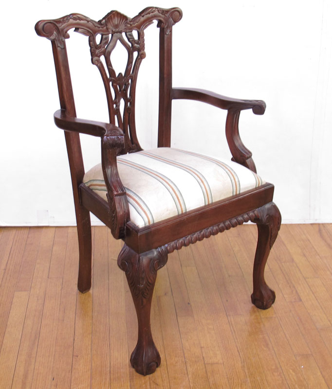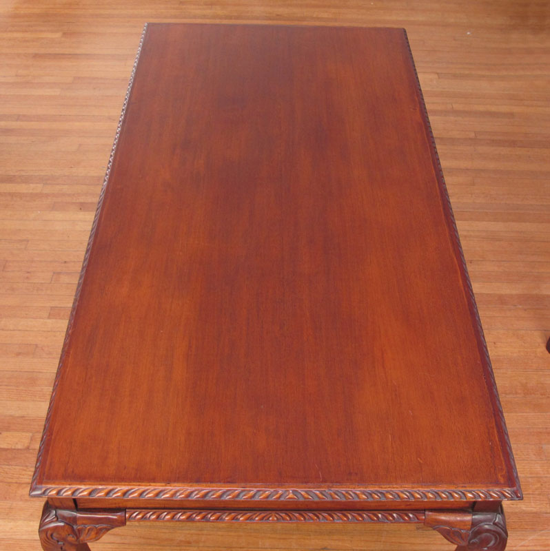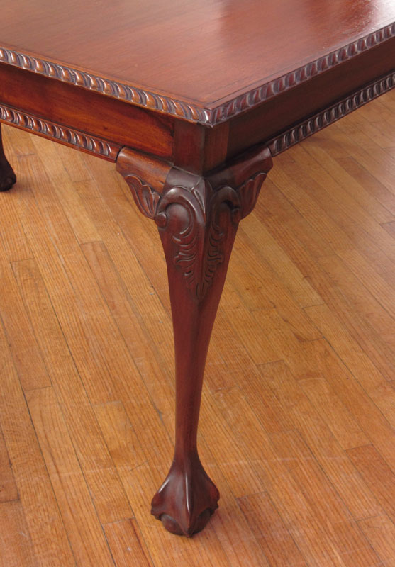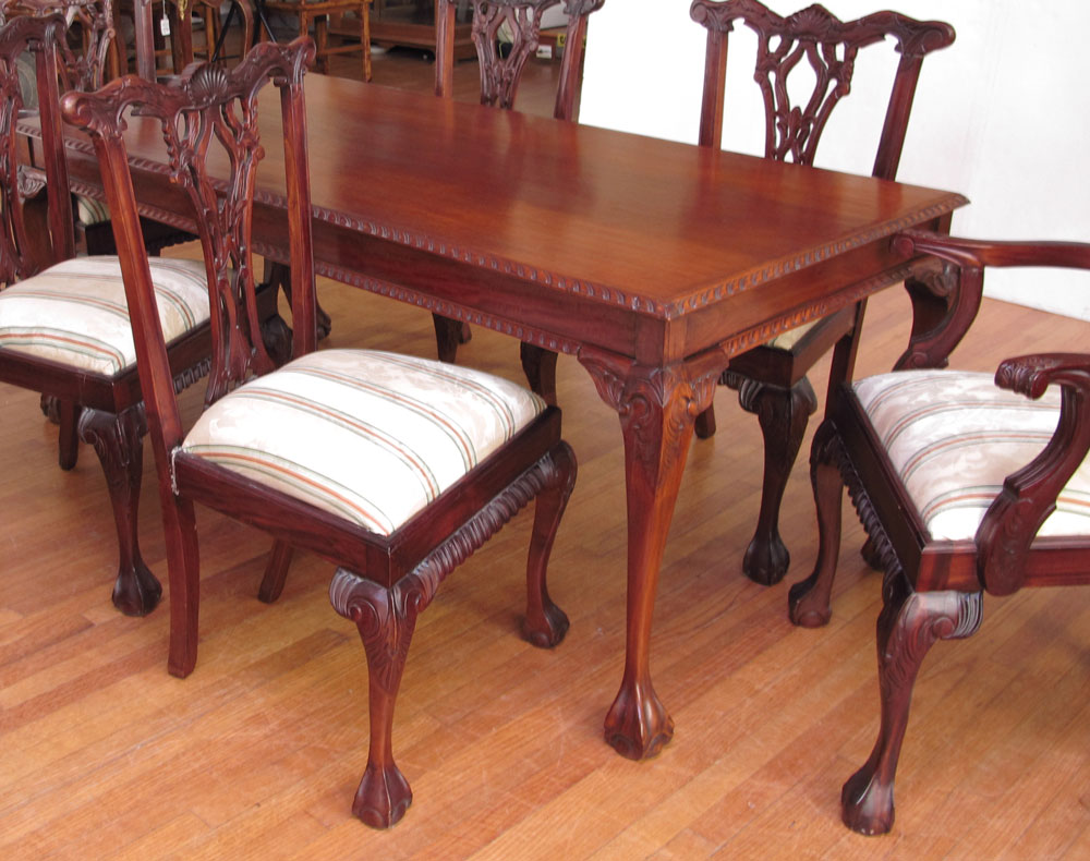 MAHOGANY DINING ROOM TABLE & CHAIRS: Chippendale style table with carved trim, legs and ball and claw feet. Table measures 29'' h. x 72'' x 36''. 6 Chippendale style chairs, 2 captains and 4 sides. Captain measures 39 1/2'' h. x 26'' x 21''.