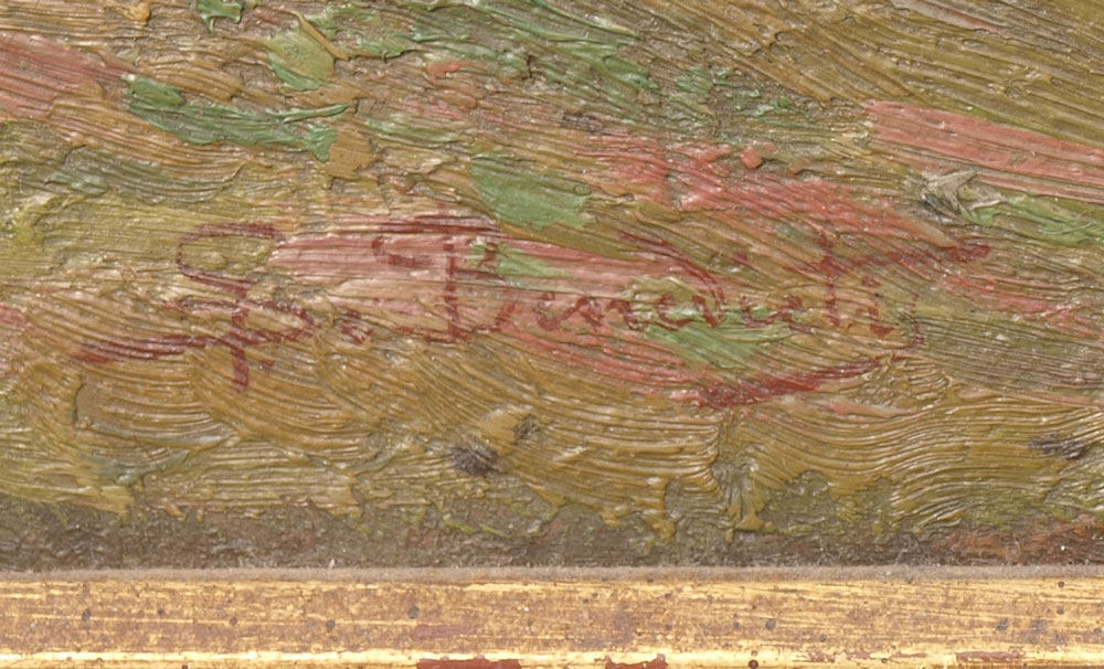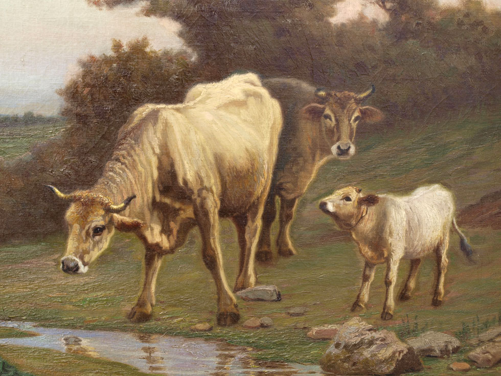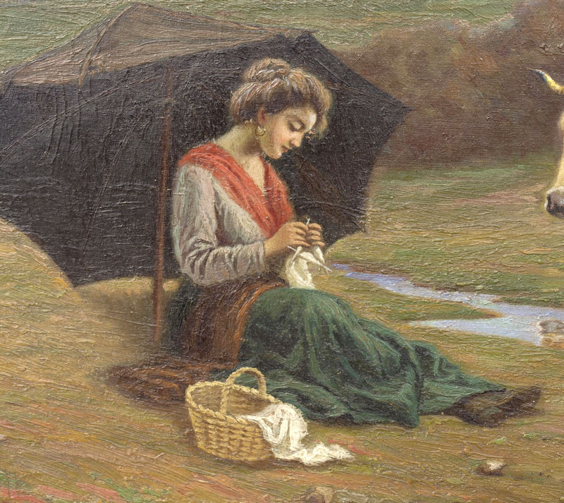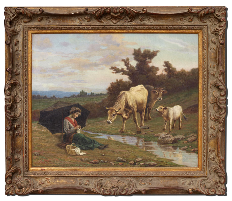BENEDICTIS, Giosue de, (Italian, 1874-1958): ''Summer Afternoon'', depicts a young maiden knitting under an umbrella with cattle grazing by a stream, O/C, 24'' x 30'', signed lower left, encase in contemporary heavy gilt carved frame, 33'' x 38 1/2''.