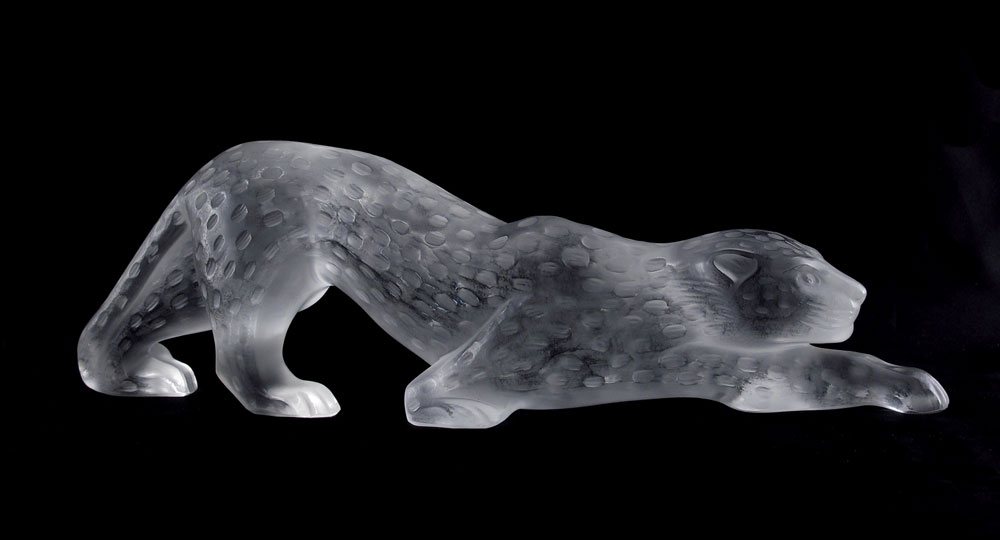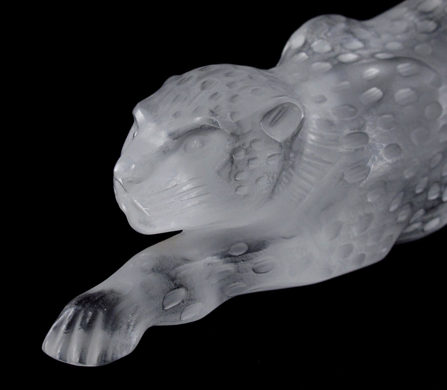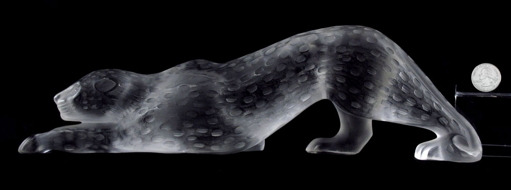 LALIQUE FRENCH CRYSTAL LEOPARD: 15''l. X 4 1/4'' tall. Frosted crystal with textured spots. Signed in script.