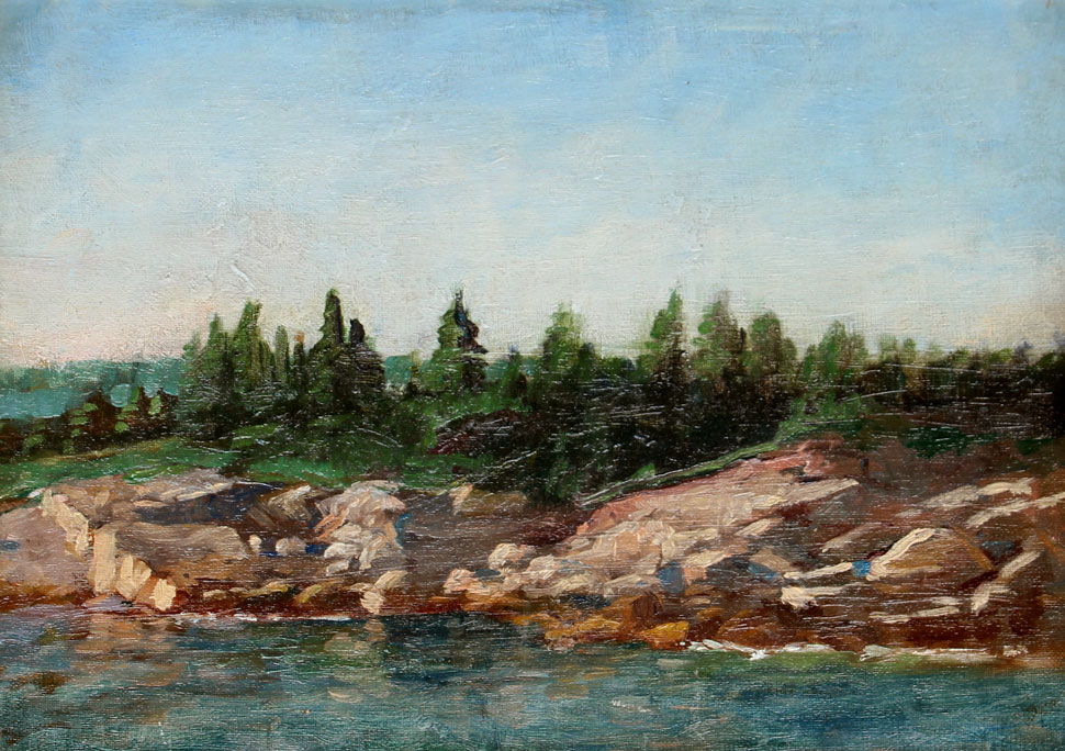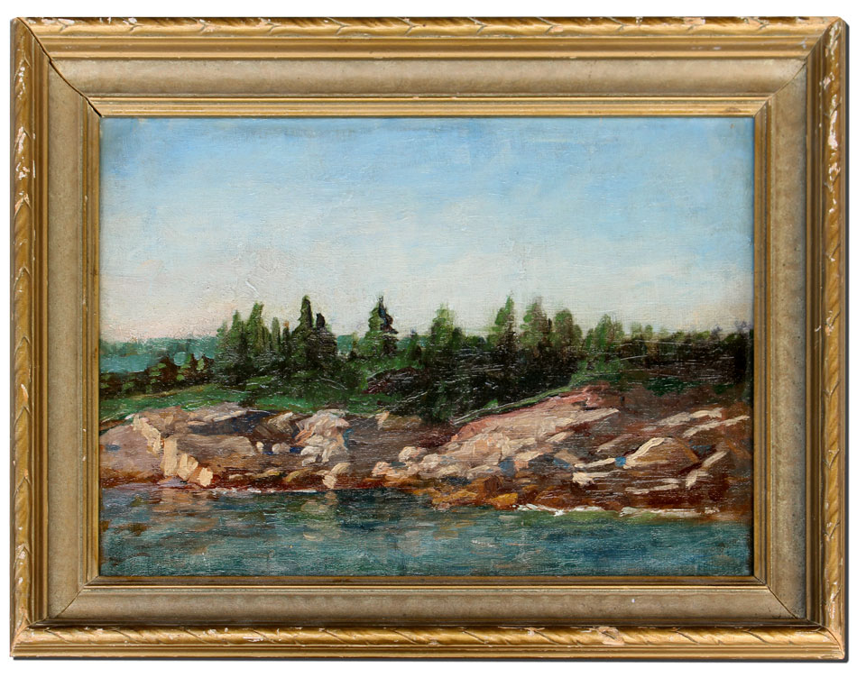 GRIER, Eldon, (Canadian, 1917-2001): Coastal Rocks, Oil/Board, 10'' x 14'', period carved and gilded frame with wear, 13'' x 17''.