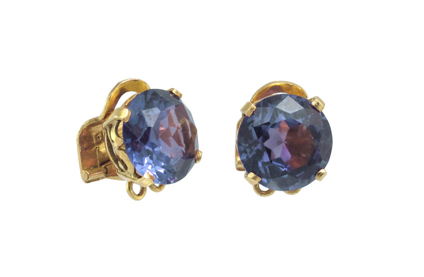 20K GOLD CHANGING COLOR SAPPHIRE EARRINGS: 20K yellow gold earrings contain two round 12.00 mm synthetic color-change sapphires. Hinged clip closure. Mounting weight: 6.7 grams. approx.