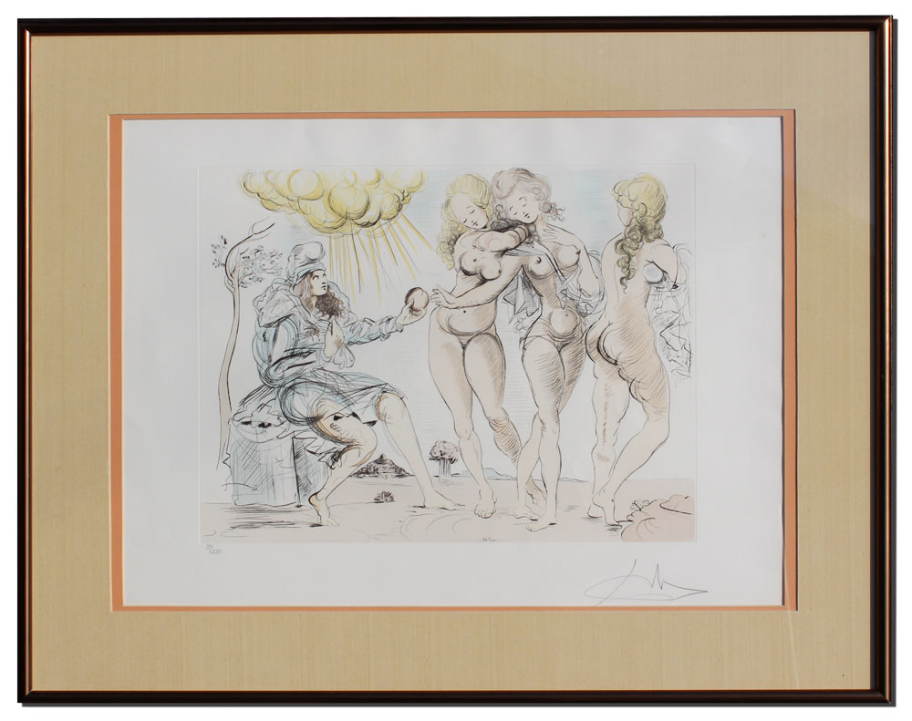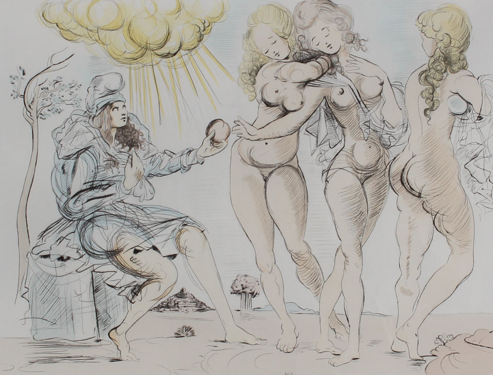 JUDGMENT OF PARIS ETCHING AFTER DALI: Etching, sight size 20'' x 27'', pencil signed lower right, numbered 33/250 lower left, contemporary metal frame and mat, 28 1/2'' x 36''.