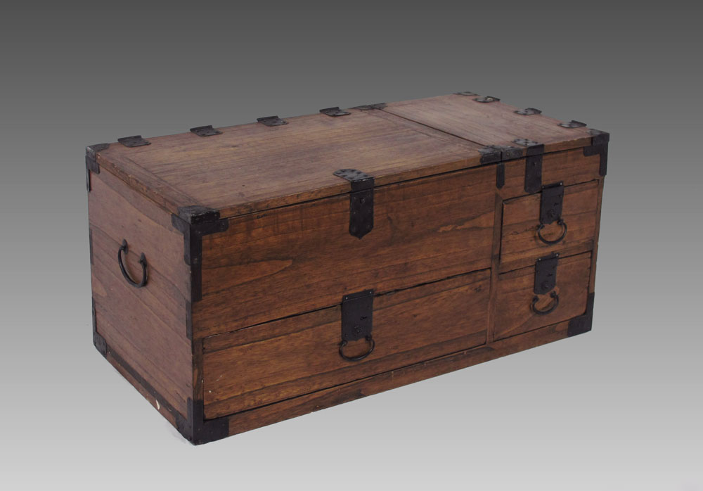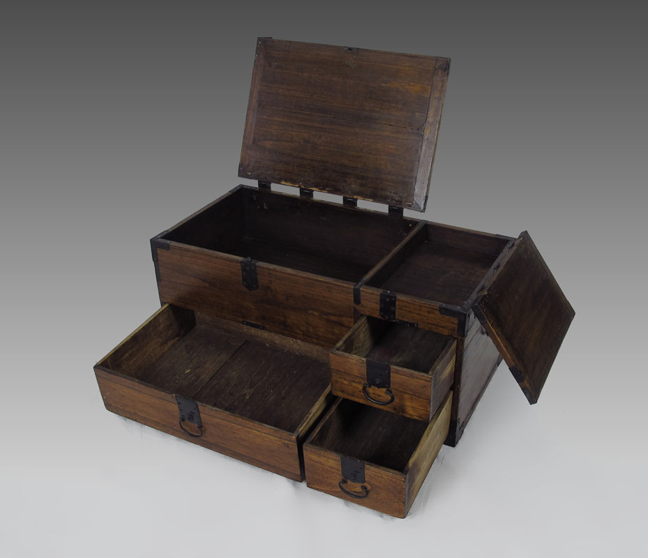 JAPANESE WOOD AND IRON CHEST: Small chest with double hinged lid top over 3/4 length single drawer and 2 1/4 length side drawers. Iron hardware. 13 3/4'' h. x 29 3/4'' x 14 1/2''.