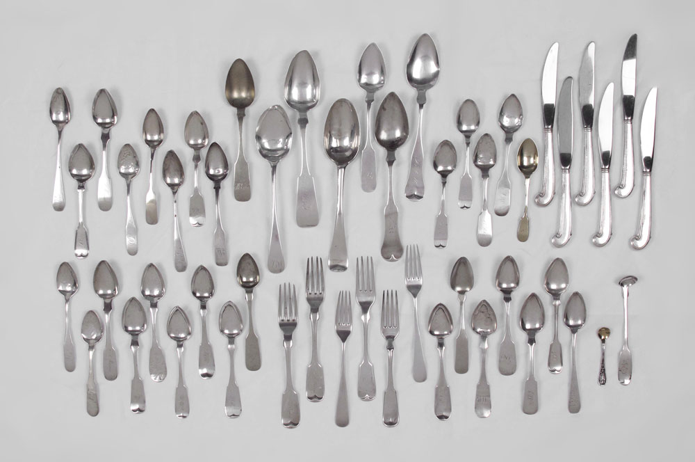 ESTATE COLLECTION OF COIN SILVER FLATWARE: Approx. 42 assorted pieces including teaspoons, forks and table spoons by a wide variety of makers. Sold with 6 sterling handle knives and sterling teaspoon. Nearly all monogrammed. Approx. 35.9 troy oz.