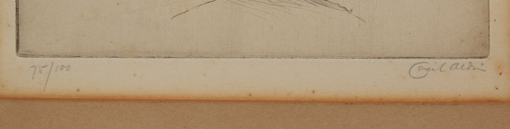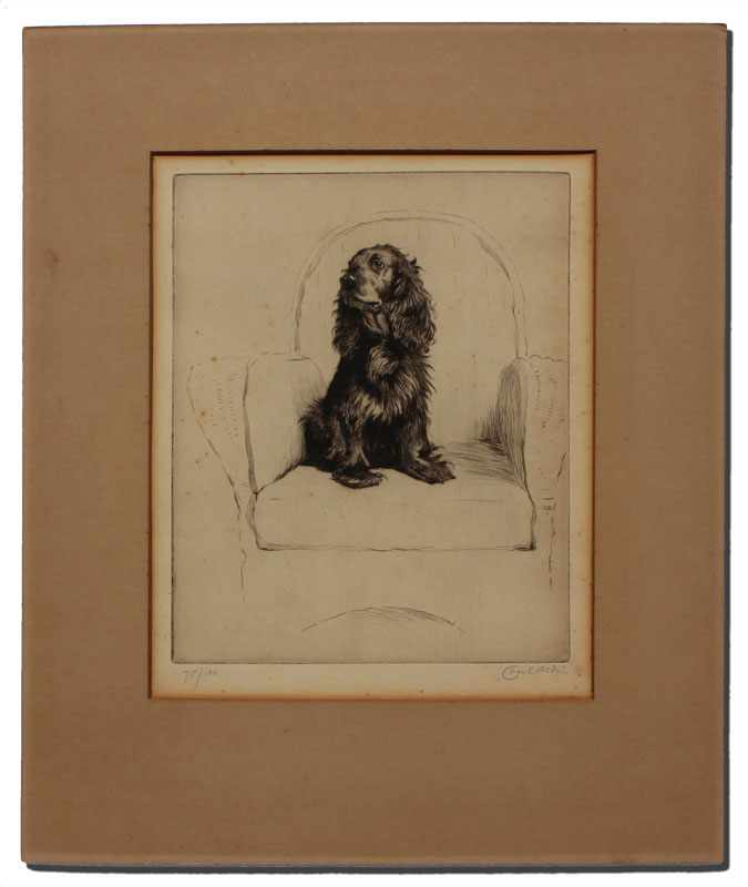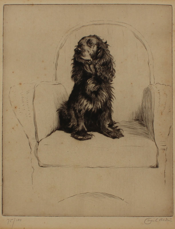ALDIN, Cecil, (British, 1870-1935): ''A Proud Cocker Spaniel'', Spaniel Seated in a Lounge Chair, Etching, 12 1/2'' x 10 3/4'', pencil signed lower right, numbered 75/100 lower left, plate size 8 1/4'' x 6 1/2'' glued to mat 14 1/8'' x 11 3/4''.