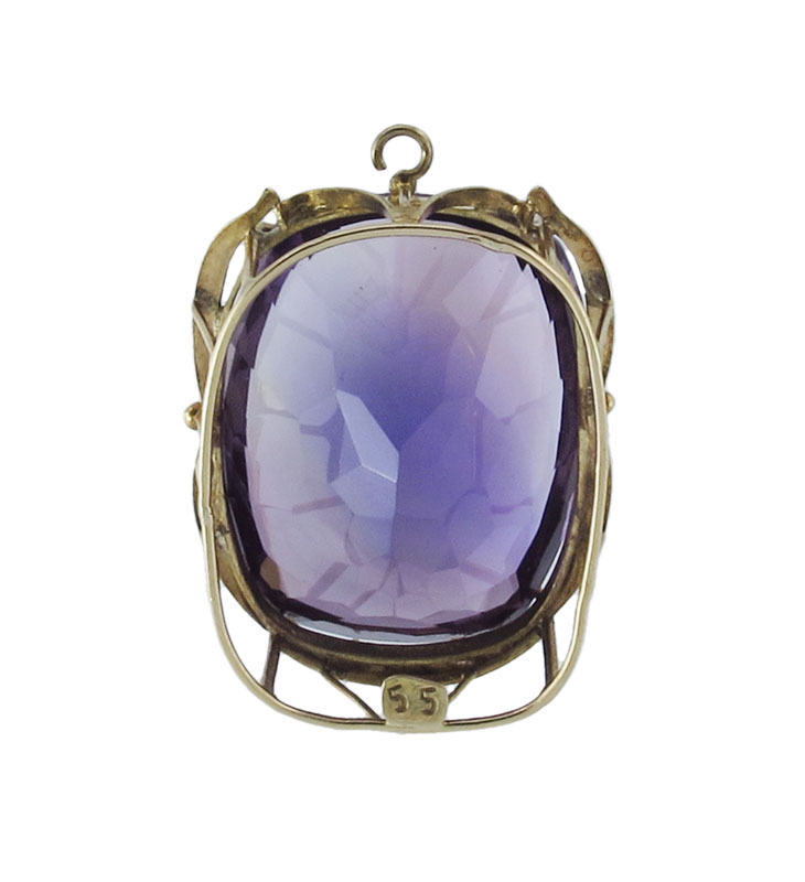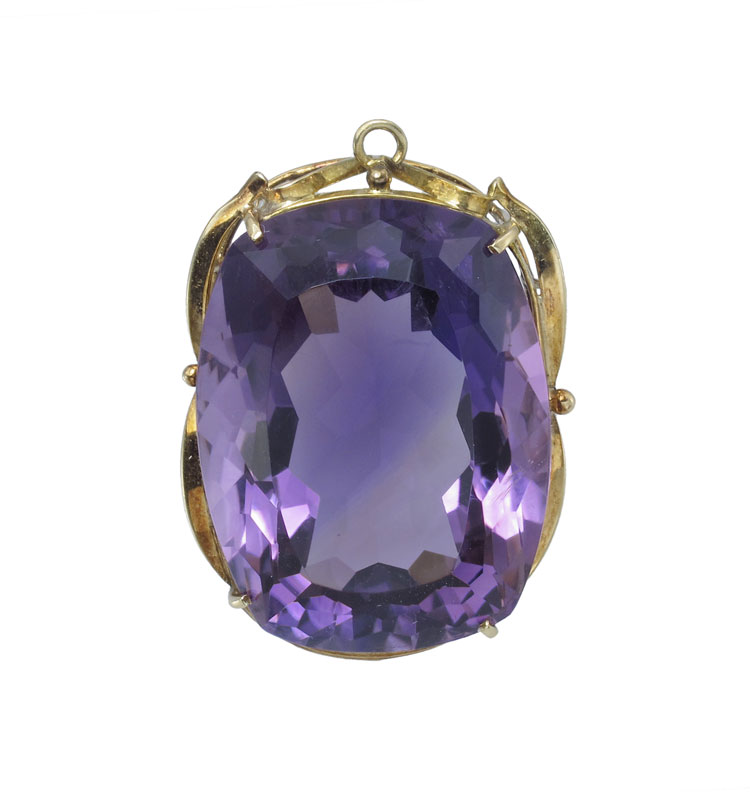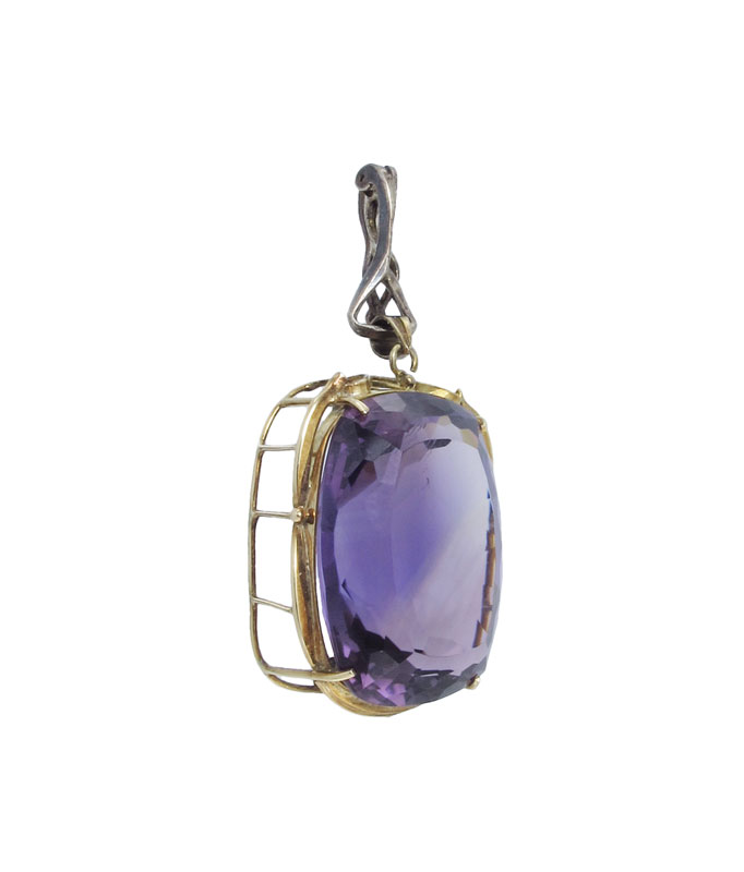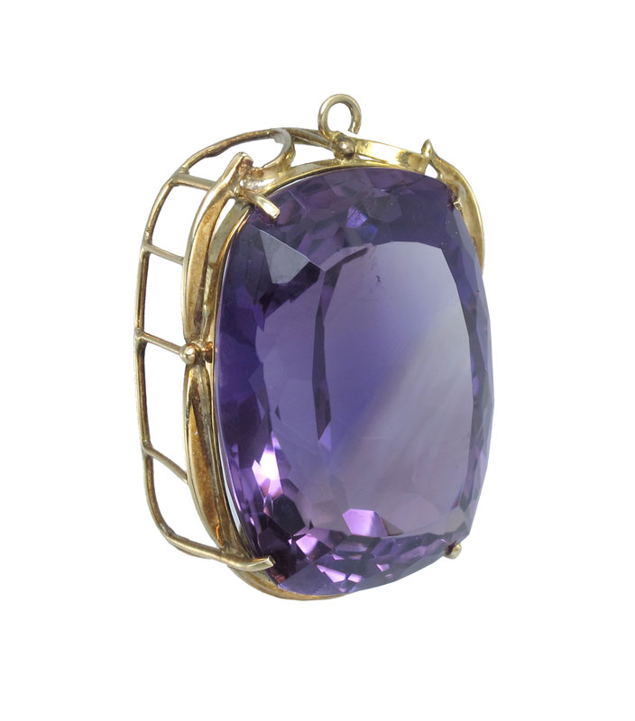 35 CT AMETHYST PENDANT: 14K yellow gold pendant featuring rectangular mixed cut amethyst. Weight: 35.00 Ct. Approx. The amethyst is prong set. Mounting Weight: 5.0 grams approx.