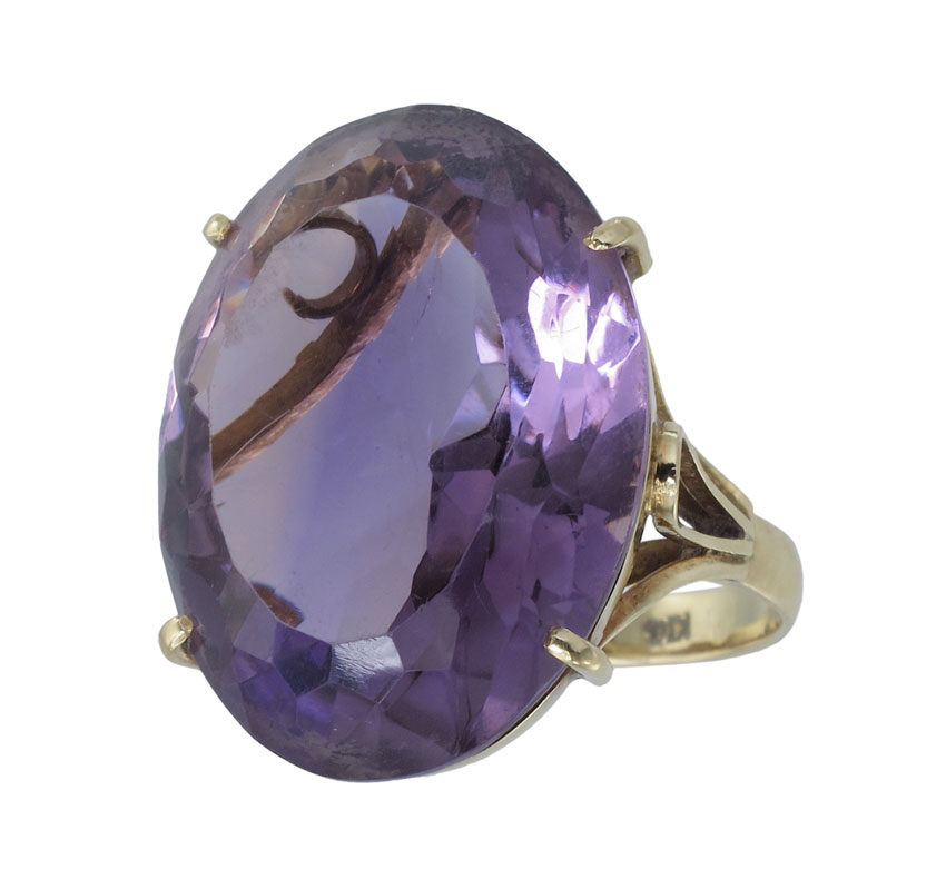 20 CT AMETHYST RING: 14K yellow gold ring contains one oval mixed cut amethyst of approx. 20.00 ct. The amethyst is prong set. Mounting Weight: 3.5 grams approx. Size: 7
