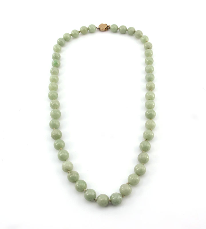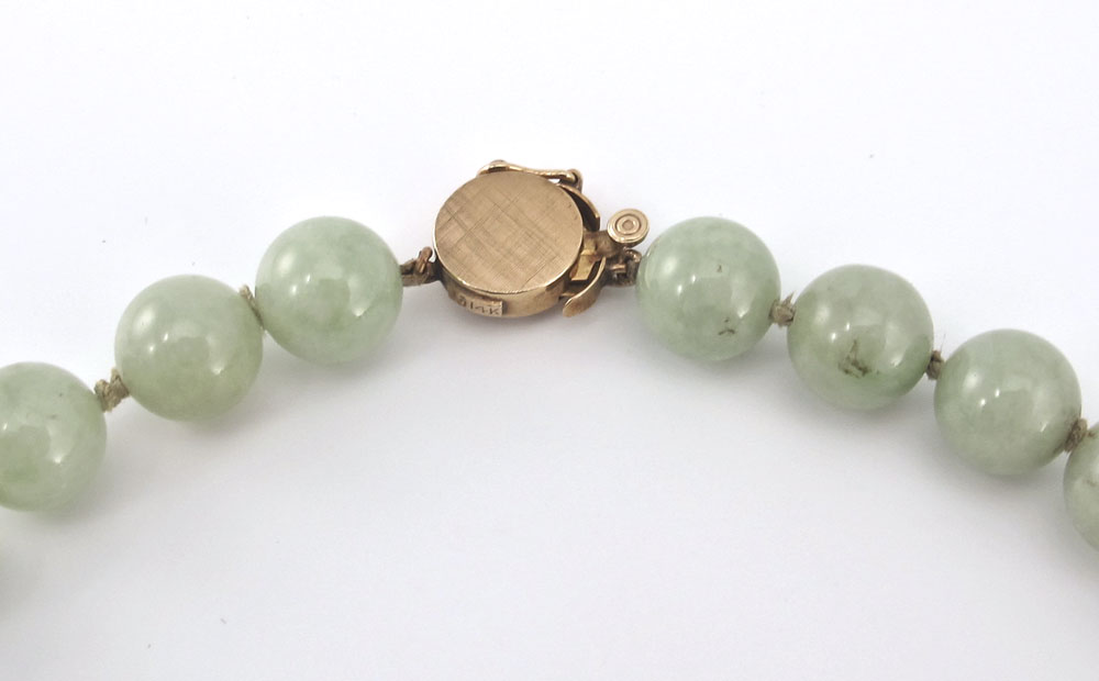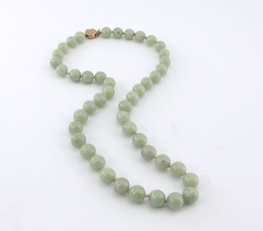 JADEITE JADE NECKLACE: A 22'' strand necklace of 11 mm jadeite jade beads, light green coloration, 14K gold clasp.