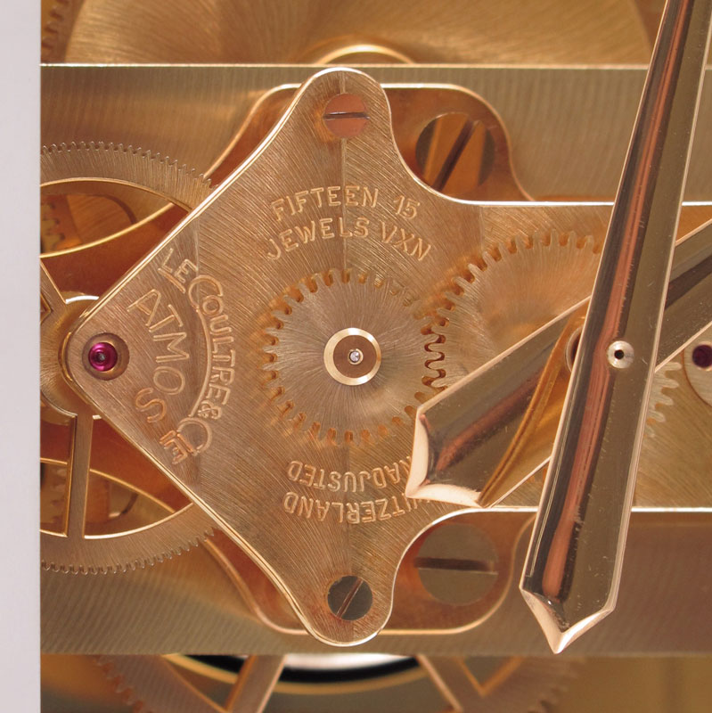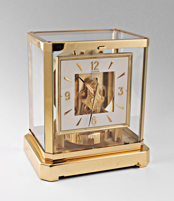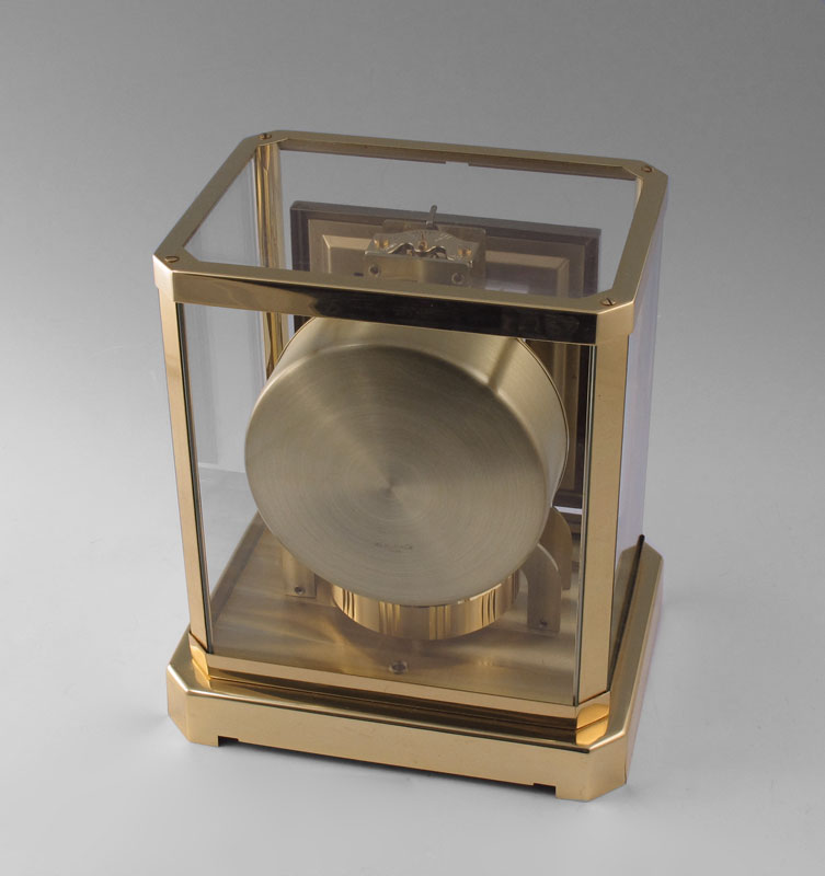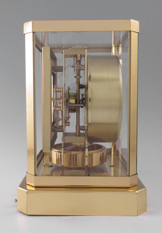 1966 LE COULTRE ATMOS CLOCK: Brass case with glass sides and front, square face. Serial number 244044 dates to 1966. 9 1/4'' h. x 8 1/4'' x 6 3/8''.