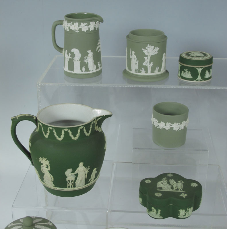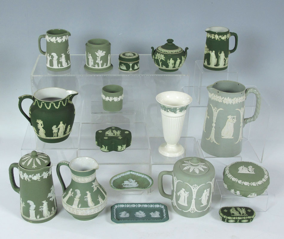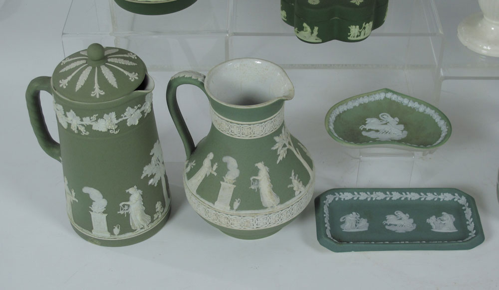 GROUP OF GREEN WEDGWOOD JASPER AND JASPER DIP: Approx. 21 pieces to include jugs, early teapot (missing spout), match box (tiny chip), trinket box. 10 pieces have England mark, 5 Made in England, and 2 unmarked. Queensware vase. The smallest jar is 1 3/4'', tallest jug 7 1/2''.