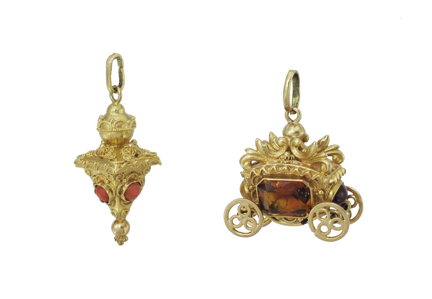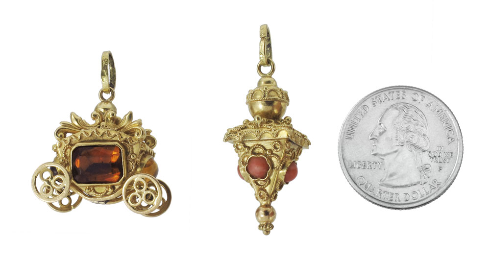 TWO CHARMING 18K GOLD GEMSTONE CHARMS: 1) Mechanical wheel turning carriage charm with four emerald and cabochon cut citrines. Height 1''. 2) Etruscan decorated lantern charm with 4 cabochon cut coral pieces, 1.5''h. Weight for both 19.3 grams.