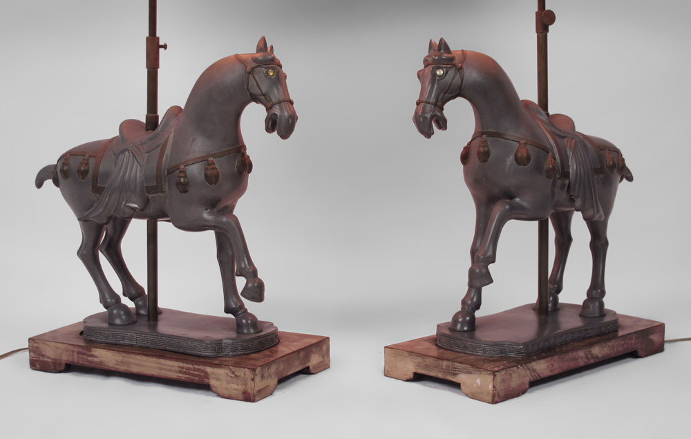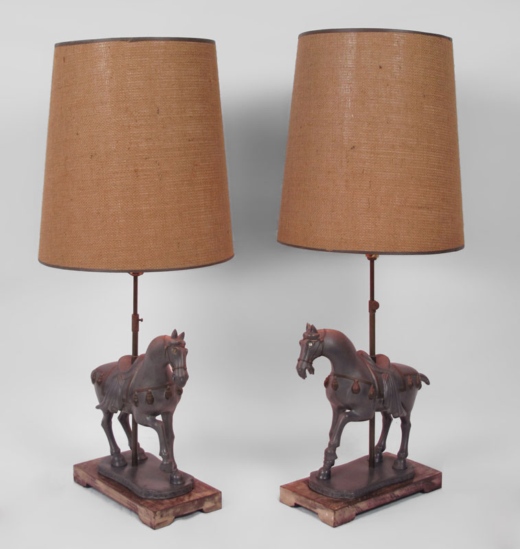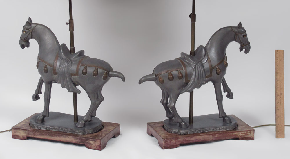 PAIR OF PEWTER TANG HORSE STYLE LAMPS: Pewter horses mounted on wood bases. Base measures 16'' h. x 16 1/2'', 31 1/2'' h. overall to finial. Sold with woven shades 17 3/4'' h. x 16 3/4''.