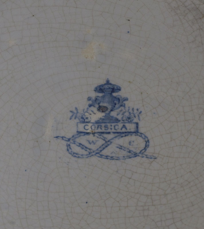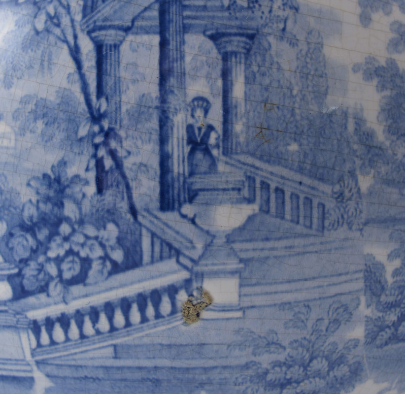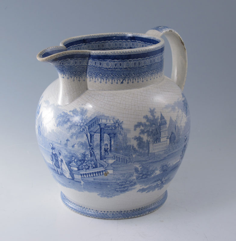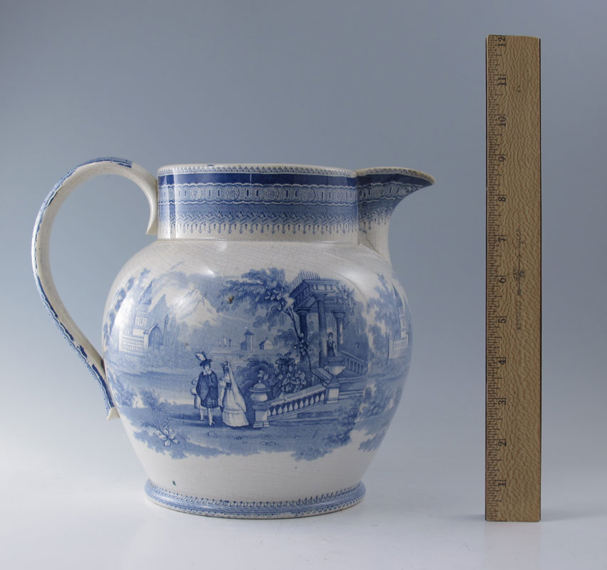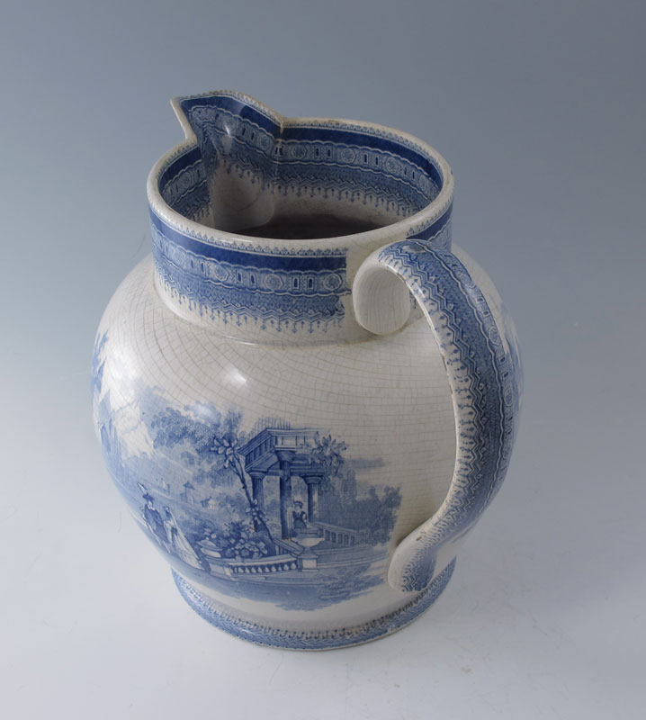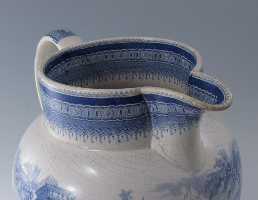 LARGE STAFFORDSHIRE BLUE TRANSFERWARE PITCHER: Circa 1835. Very large example by Wood & Challinor, Brownhills Pottery, Turnstall, Staffordshire. 9'' h. x 11''.