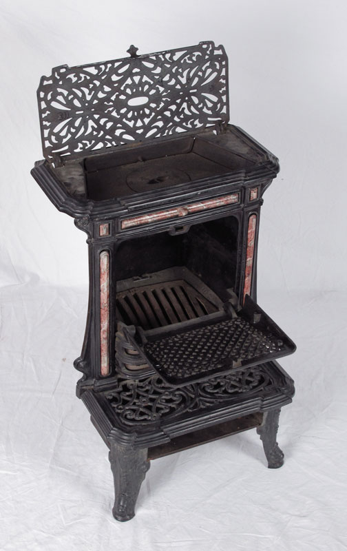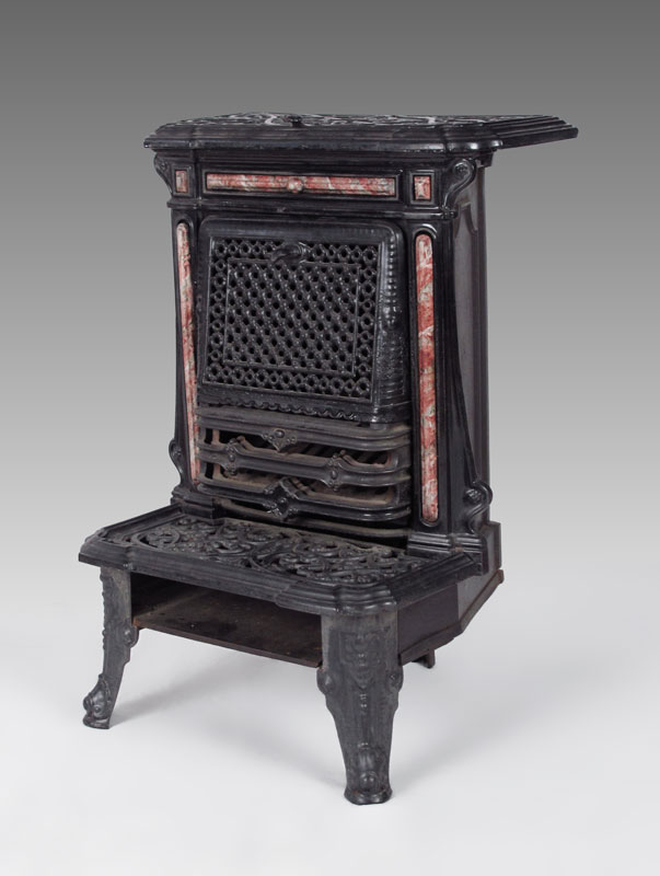 VICTORIAN CAST IRON PARLOR STOVE: Filigree cast iron with marble accents. 24 3/4'' h. x 15 1/2'' x 17 1/2''.
