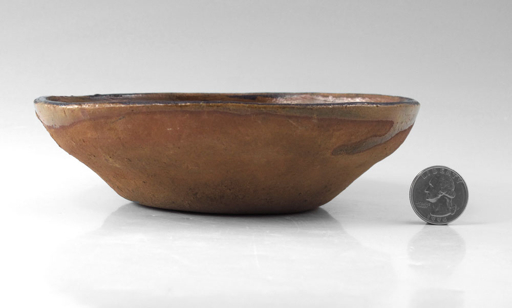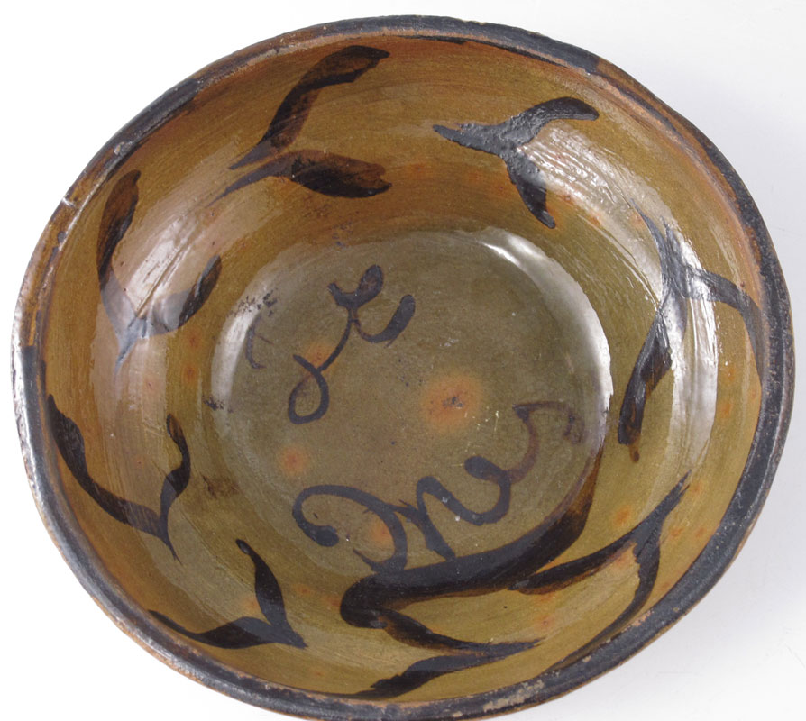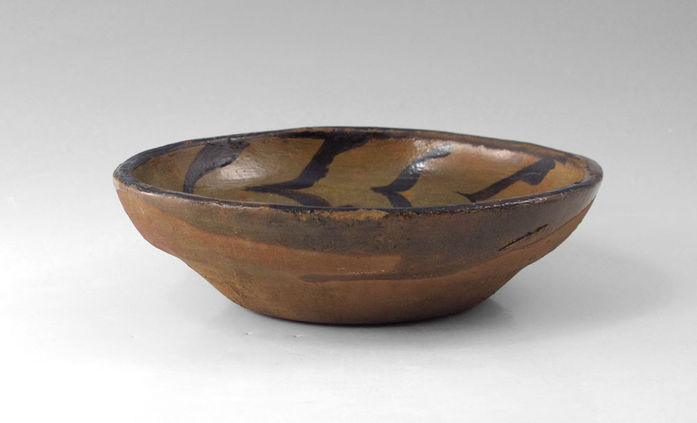 REDWARE SLIP DECORATED GLAZED BOWL: Unsigned, abstract slip decoration. 2'' h. x 6 1/2'' dia.
