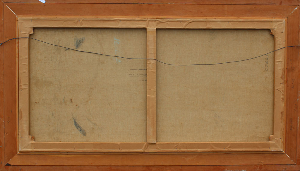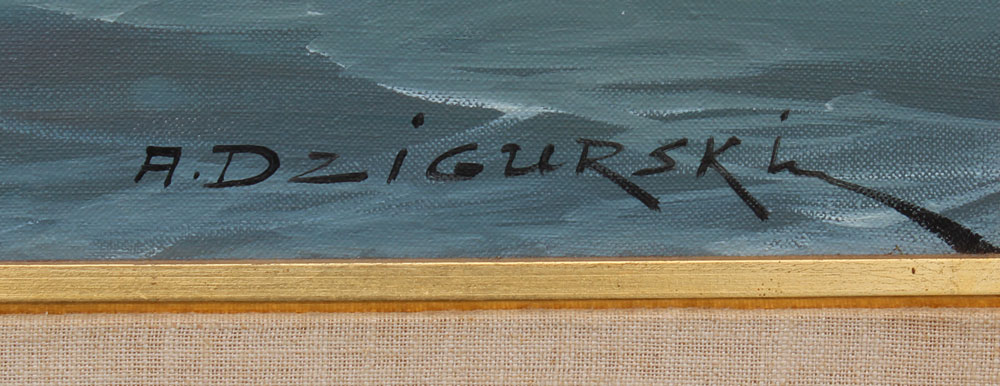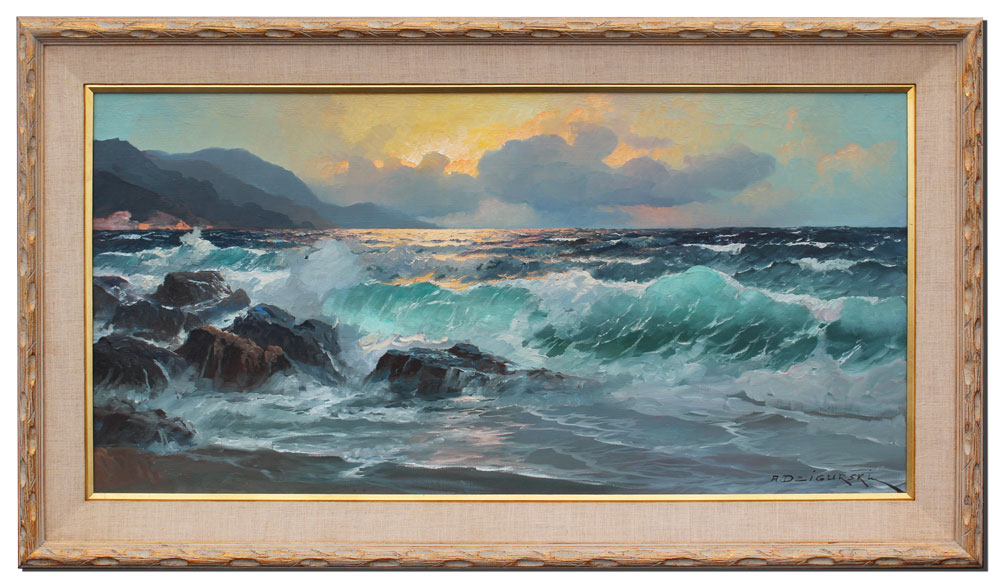 DZIGURSKI, Professor Alexander, (American, 1911-1995): California Coastal Surf, Oil/Canvas, 24'' x 48'', signed lower right, encased in original carved and painted frame, 32'' x 56'', ''Copyright Prof. Alex Dzigurski'' stenciled to the canvas verso.