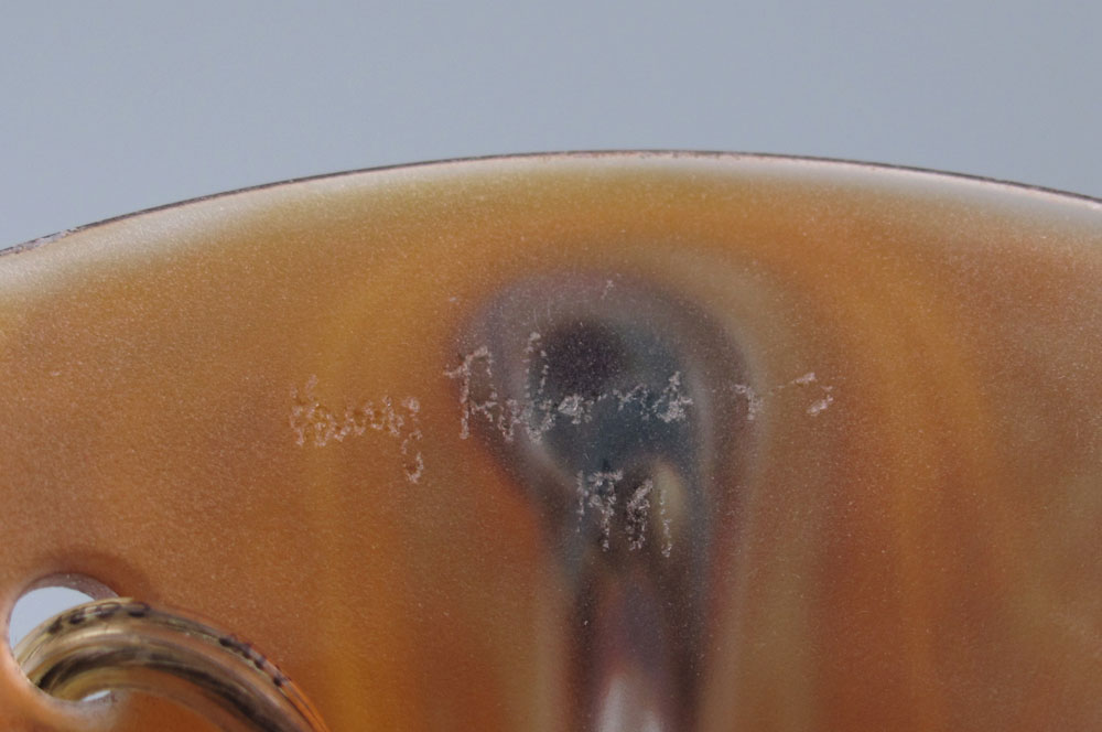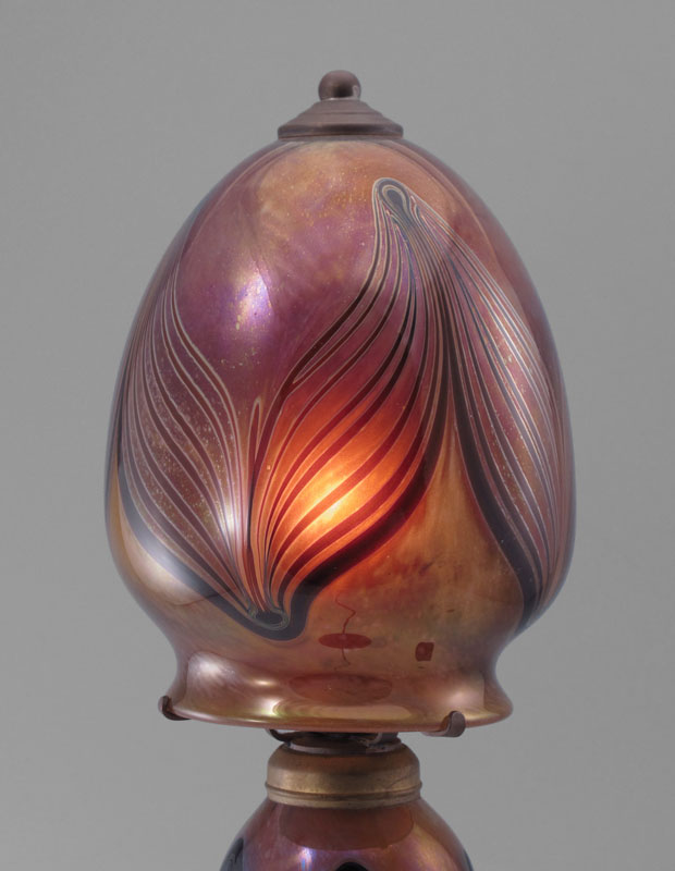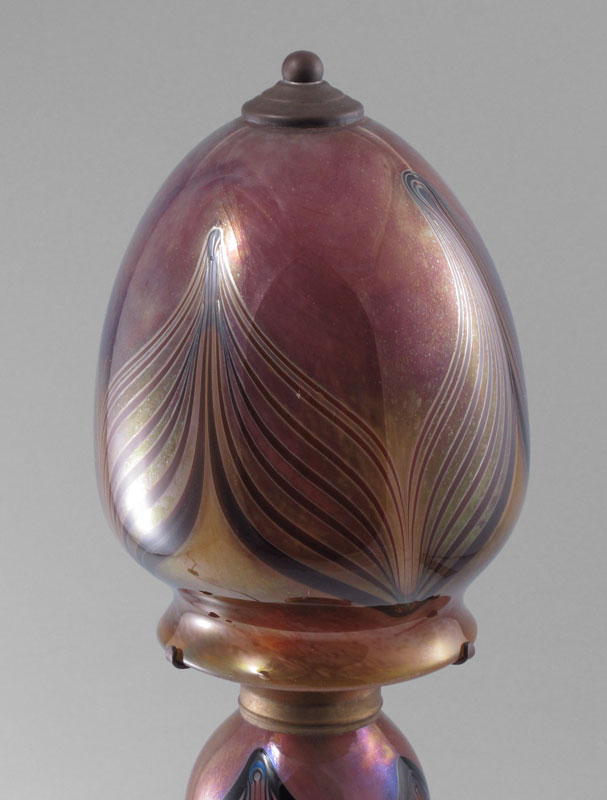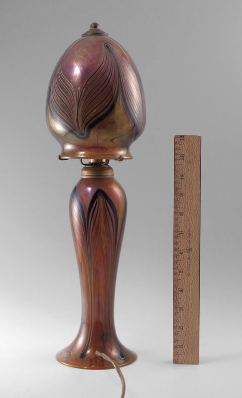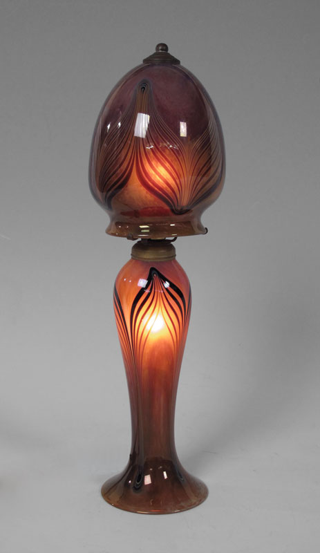 ART GLASS PULLED FEATHER DESIGN LAMP: Pulled feather design on base and shade, the base lights. Illegibly signed, 18'' tall overall.