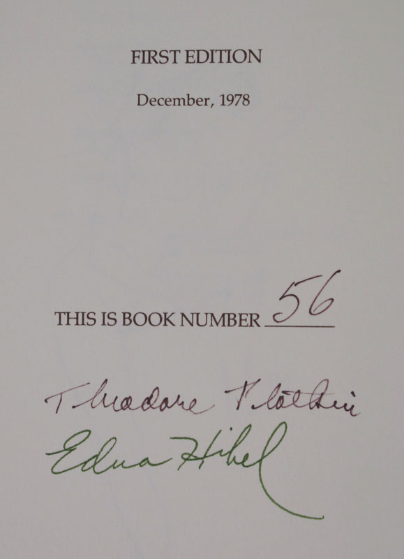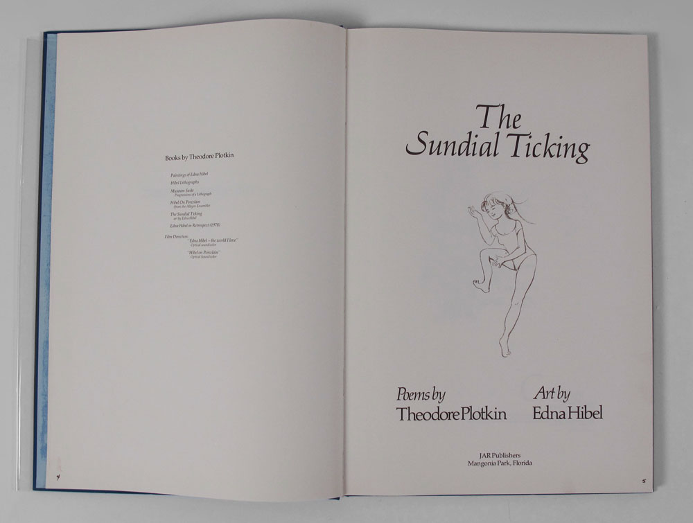 SIGNED THE SUNDIAL TICKING FIRST EDITION BOOK: ''The Sundial Ticking'' by Theodore Plotkin and art by Edna Hibel, stated first edition, limited edition number 56, signed by Theodore Plotkin and Edna Hibel. Published by JAR Publishing in 1978. Blue cover with clear plastic dust jacket. Overall fine condition. 18 1/4'' x 12 1/4''.