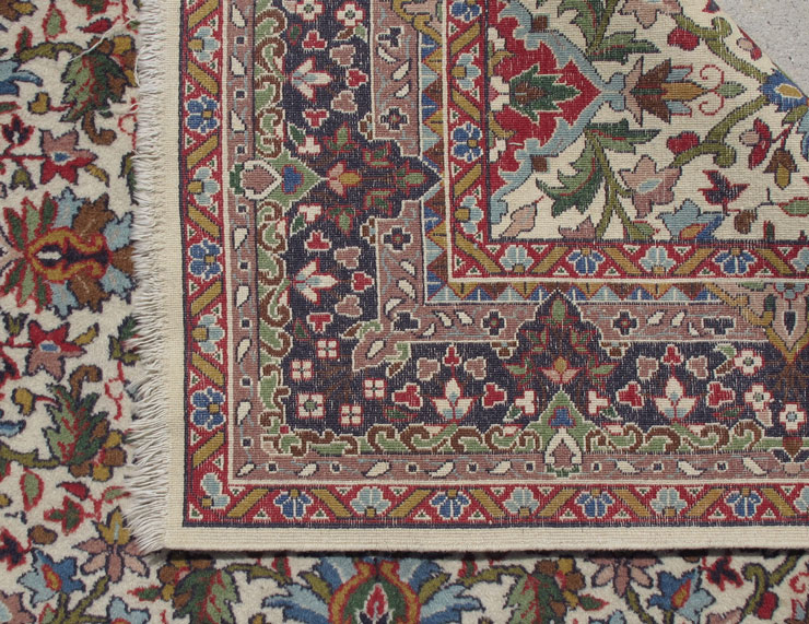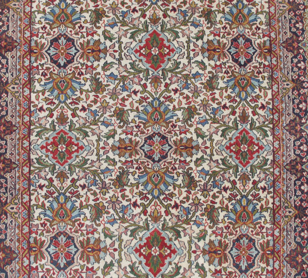 MODERN PAK-PERSIAN HAND KNOTTED WOOL RUG, 6' 2'' x 4' 2'': This cheerful, pretty rug has an overall design of three small medallions in a row with flowers leaves and vine radiating out from each central motif. This design is repeated in rows over the whole field. There is a lot of green used in this rug and that is not common in most rugs. All the colors are very clear and crisp, from the greens and the reds to the white field the colors are displayed on. The borders frame the field just as they should. Condition is very good.