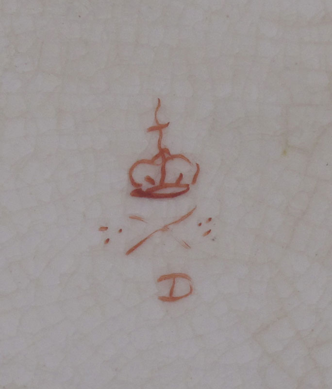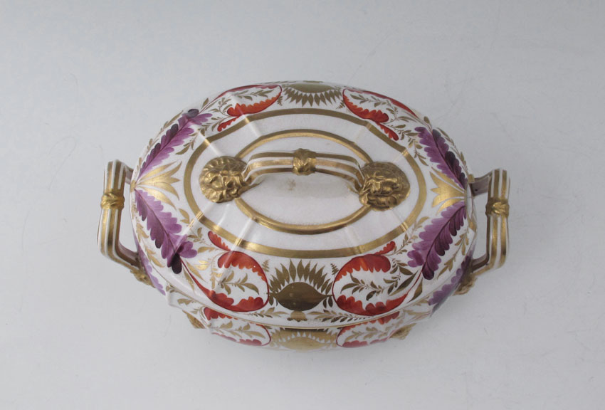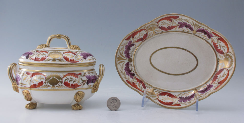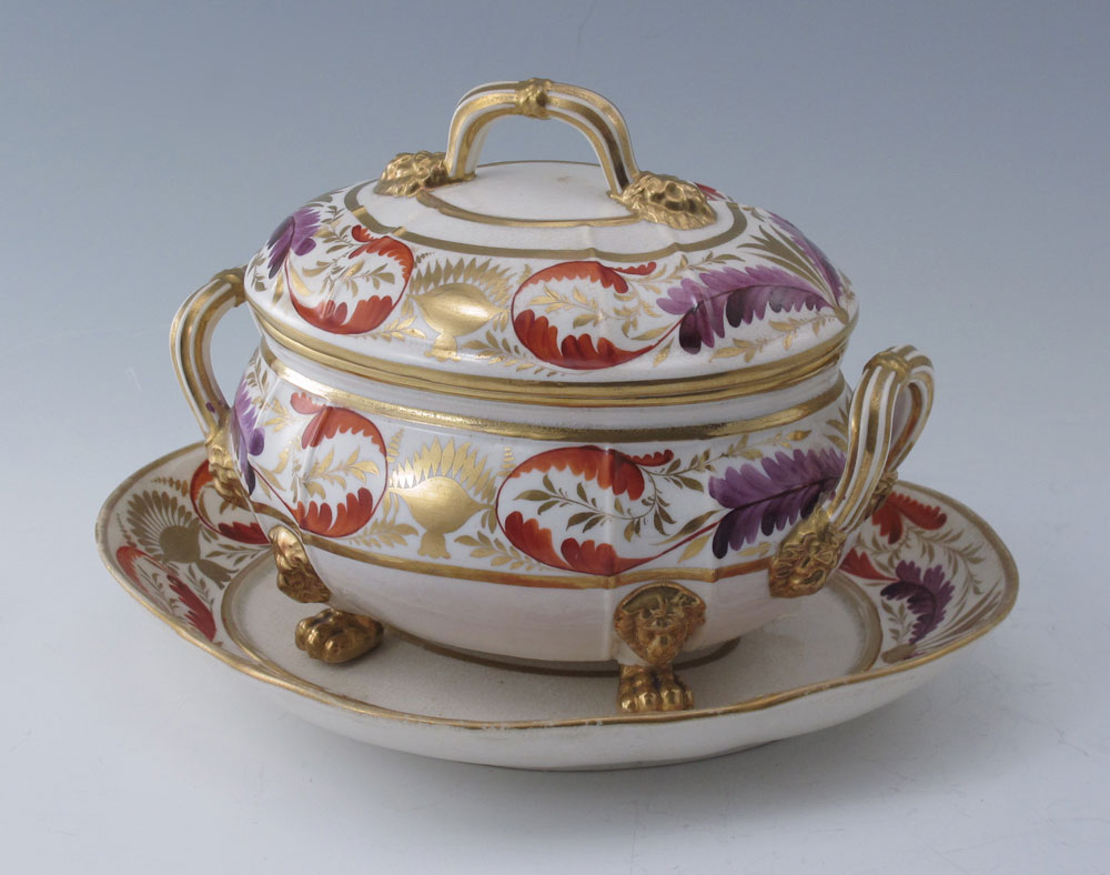 EARLY DERBY PORCELAIN SAUCE TUREEN Ca. 1782-1830: Parcel gilt and hand painted. Covered tureen with lion paw feet and the underplate both bear the old Derby crown -cross sword-D marks. Underplate measures 8 1/2''l. Tureen 5'' x 7''l.