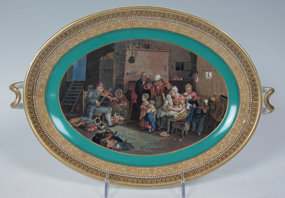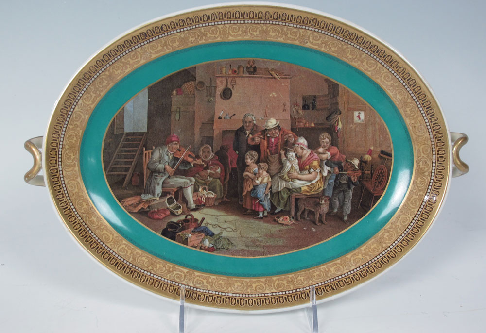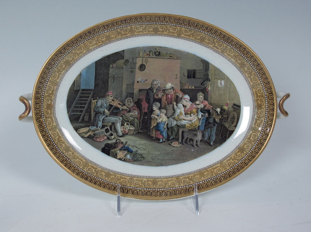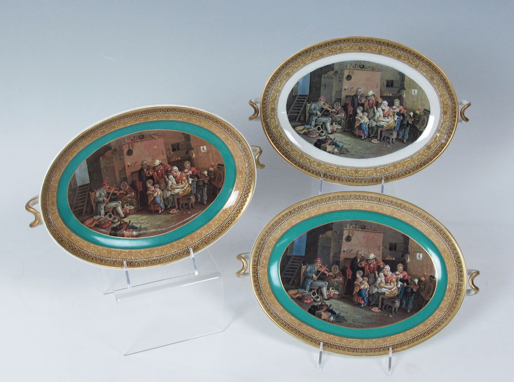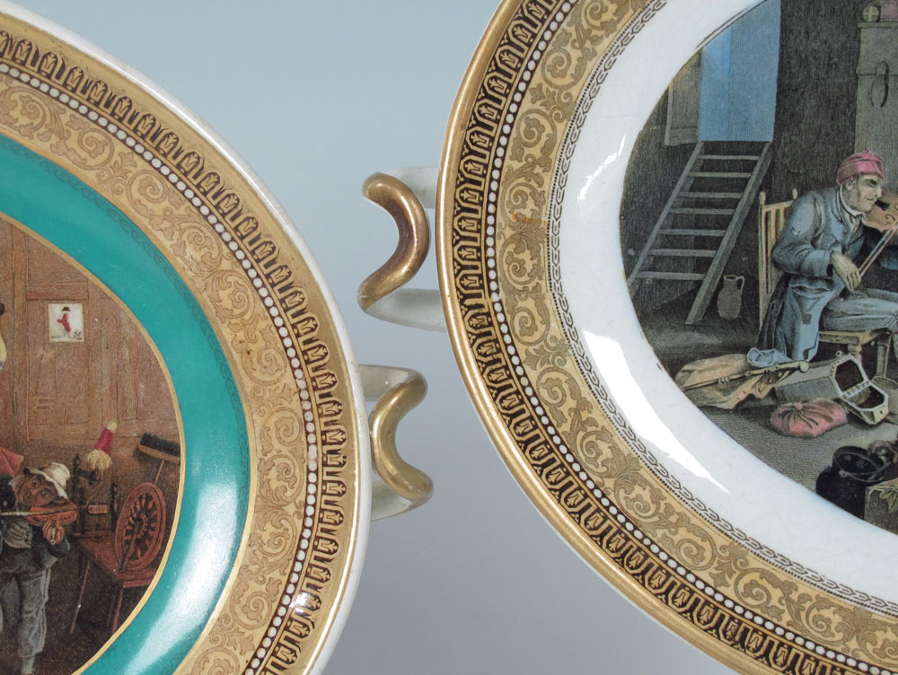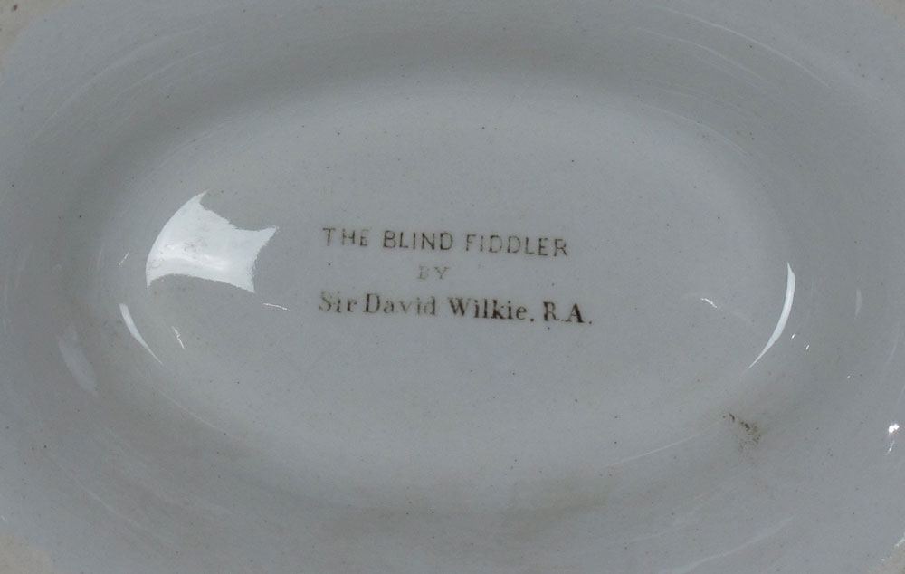 3 PRATTWARE COMPOTE SERVERS: Each depicting ''The Blind Fiddler'' by Sir David Wilkie. Approx. 13.5 including the handles, 1.5'' tall.