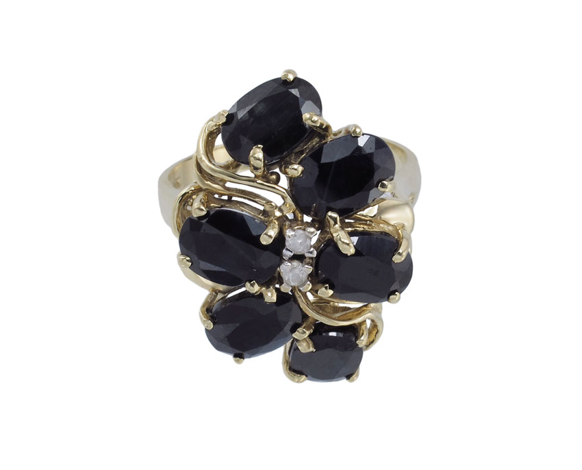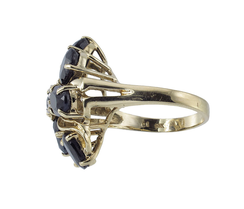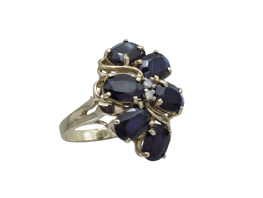 14K SAPPHIRE & DIAMOND RING: 14K yellow gold ring contains six oval mixed cut sapphires. Weight: 6.75 Ct. Approx. Two round full cut diamonds. Weight: .02 Ct. The sapphires and diamonds are prong set. Weight: 6.3 grams. Size: 7