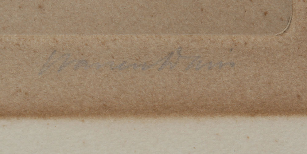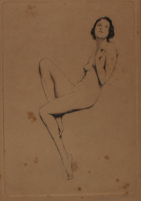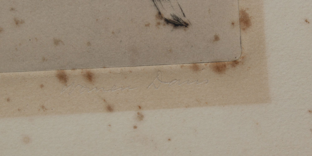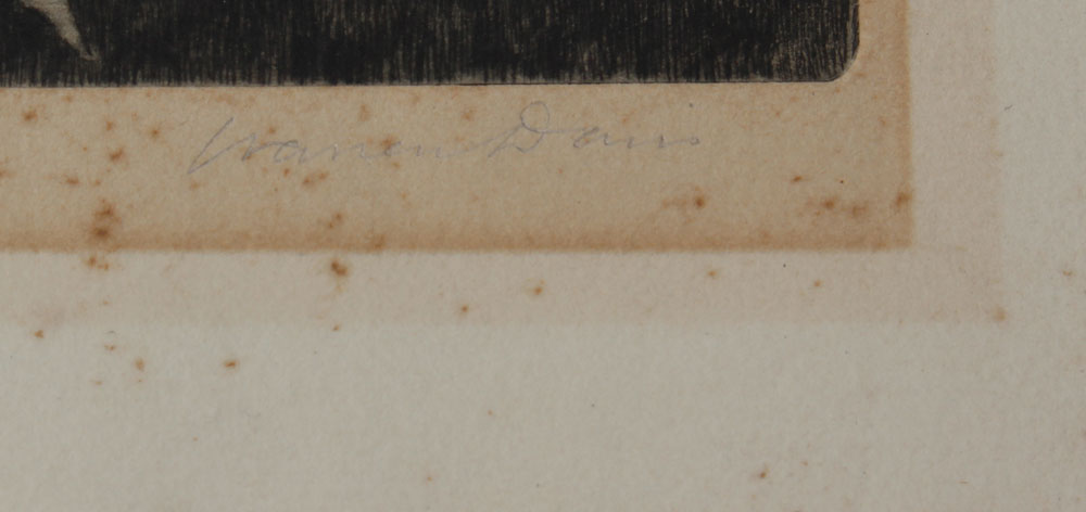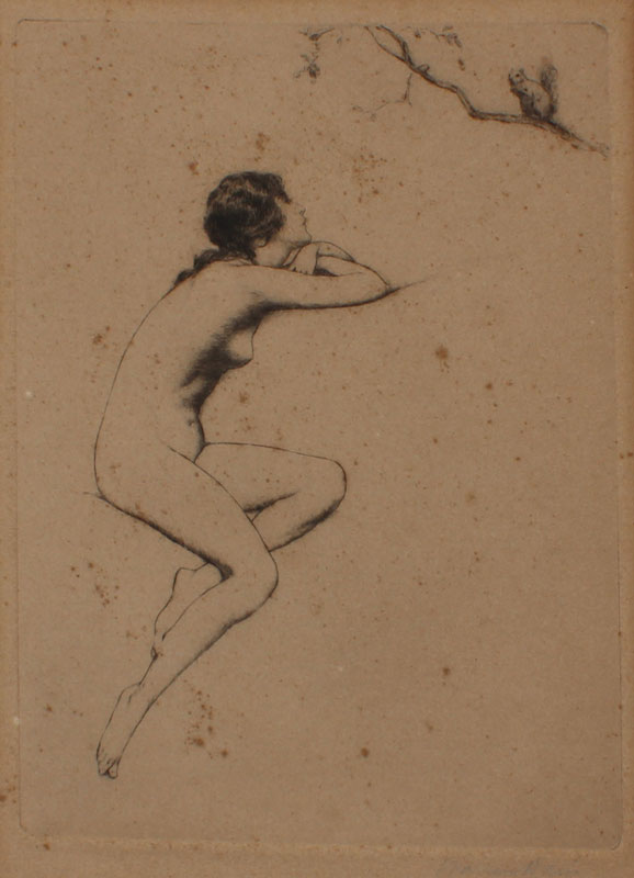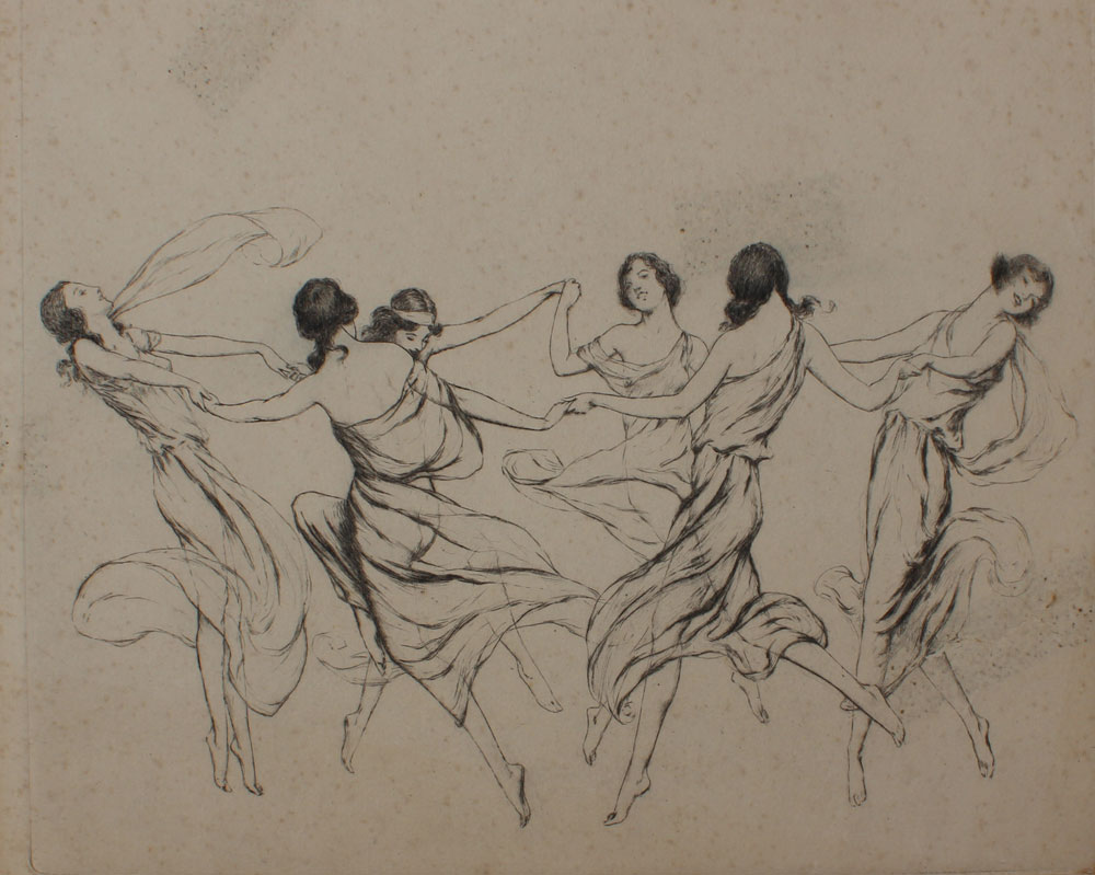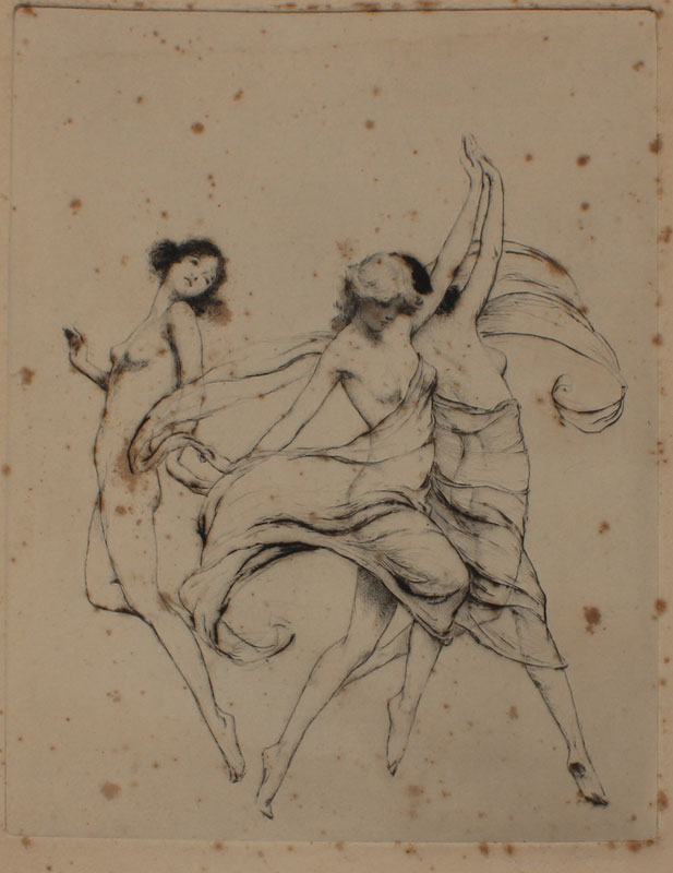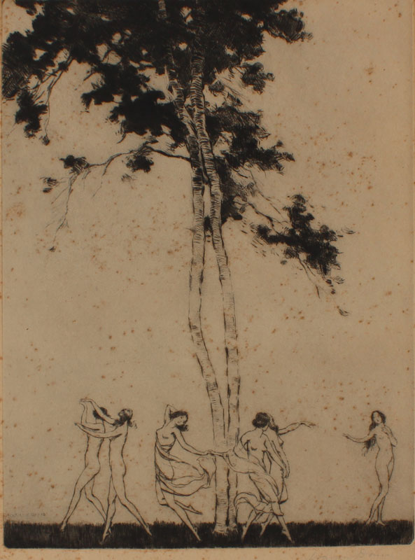 DAVIS, Warren, (American, 1865-1928): DAVIS, Warren: 5 Piece Etching Lot to include 1) Six Maidens Dancing Around a Tree, 15'' x 11 3/8'' with margins, plate size 9 3/4'' x 7 7/8'', pencil signed, unframed. Glue and paper remnants in upper and lower margins, vertical stain in left margin, light struck, scattered foxing throughout; 2) Seated Nude, 13 1/2'' x 10'', pencil signed, unframed, plate size 7 3/4'' x 5 3/4''. Tape and glue remnants in corners, scattered foxing throughout, the image is toned, crease in upper right corner; 3) Nude With Squirrel, 14'' x 11 1/4'' with margins, pencil signed, plate size 7 5/8'' x 5 7/8'', unframed. Scattered foxing, partial paper loss to upper corners, staining in upper left corner, scattered foxing throughout; 4) Six Maidens Dancing, 11 3/8'' x 14 1/8'' with margins, pencil signed, unframed, plate size 7 3/4'' x 9 3/4''. Dog eared corners, several taped areas of repairs to tears both in the image and in the left margin, scattered foxing throughout, lightly toned in the image; 5) Three Nudes Dancing, 15 3/4'' x 11 1/4'', pencil signed, unframed, plate size 9 3/4'' x 7 3/4''. Tape remnants in upper corners, 2 major vertical creases, scattered foxing throughout.