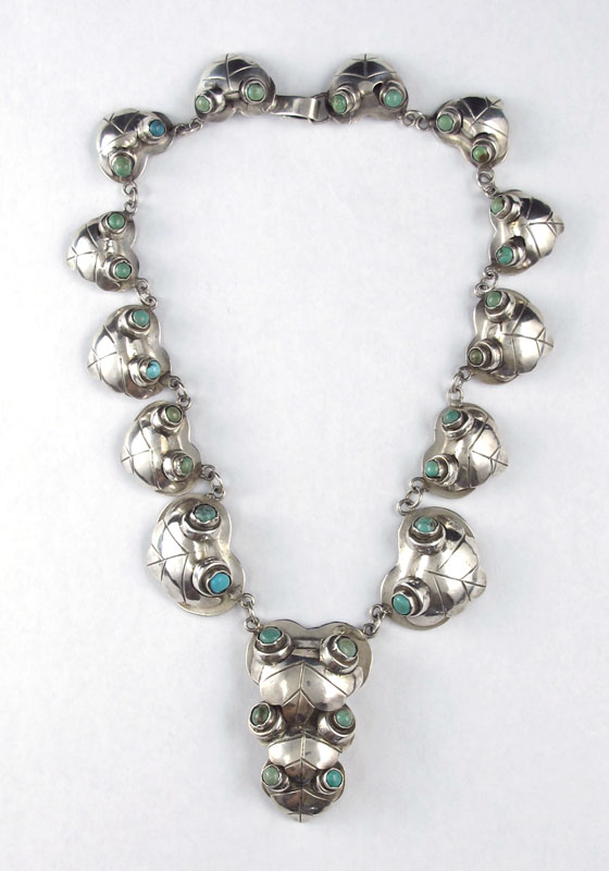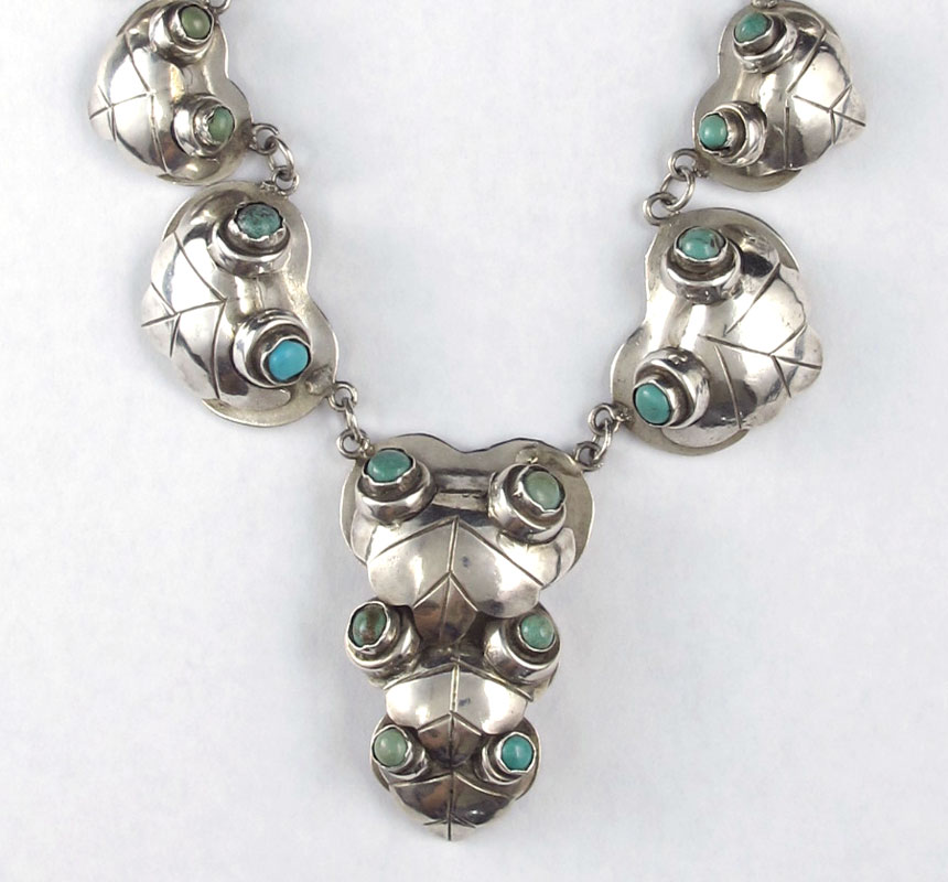 MEXICAN SILVER NECKLACE WITH TURQUOISE CABOCHONS: Bud and foliate motif links of silver set with small cabochons of turquoise, marked Made in Mexico with illegible word below, 16''l., center pendant 2''l.