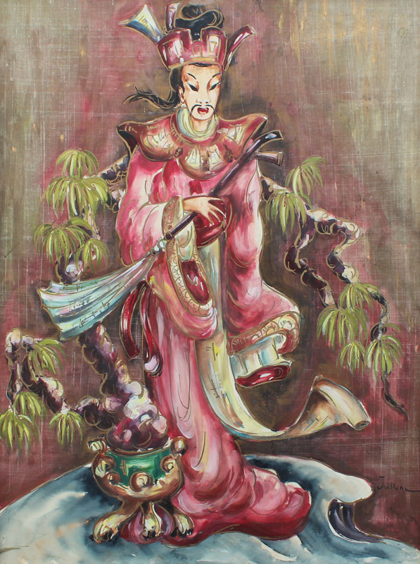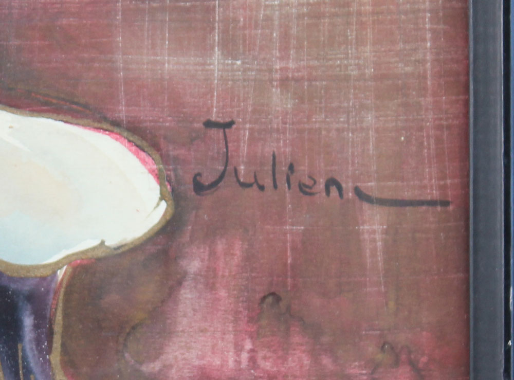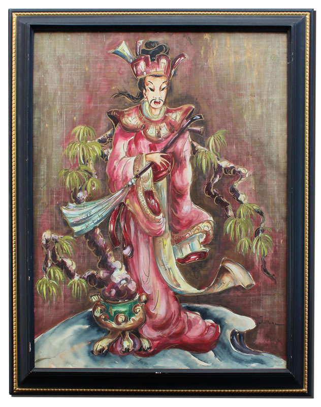 JULIEN, Rene, (Belgian, 1937-): Oriental Still Life With Fu Man Chu Doll, Watercolor/Gouache, sight size 29 1/2'' x 23 1/2'', signed lower right, painted black frame with wear, 35'' x 30''