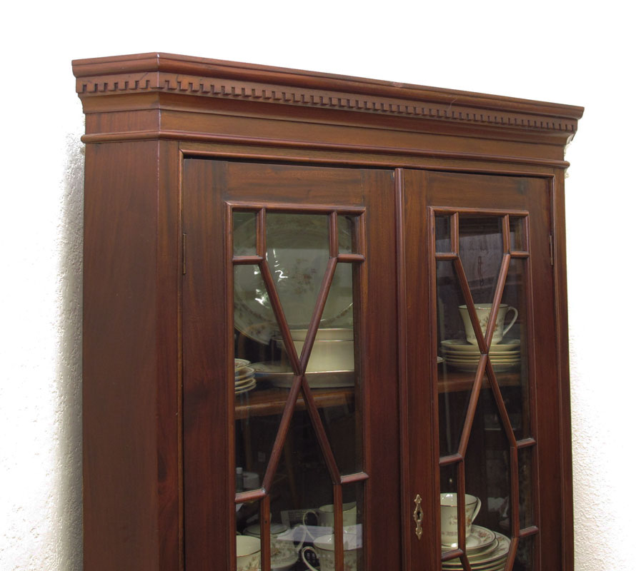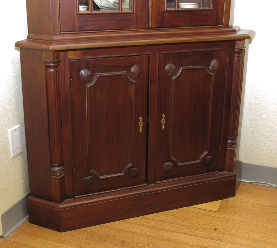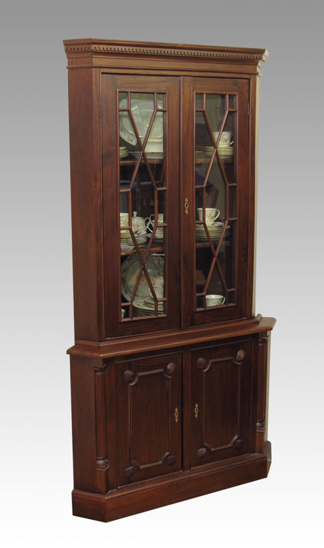 MAHOGANY CORNER CABINET: 2 glass door top with 2 interior wood shelves over 2 door case with applied wood decoration, single interior shelf. 76 1/2'' h. x 40 1/2'' x 20 1/2''.