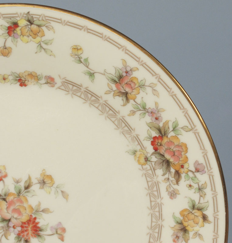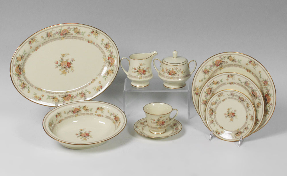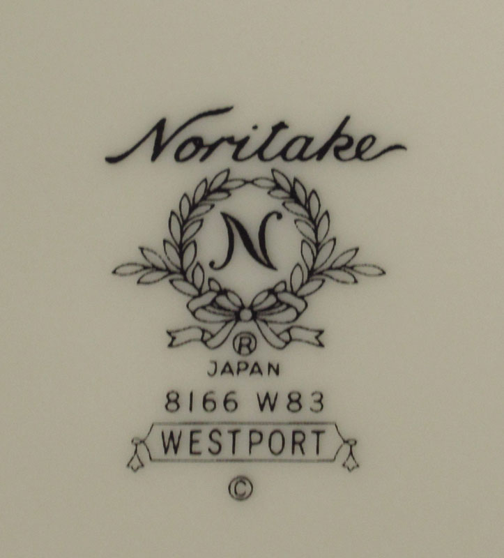 NORITAKE FINE CHINA SERVICE FOR 8 IN THE WESTPORT PATTERN: 50 pieces to include 8 dinner plates, 10 salad, 10 bread, 8 cups, 8 saucers and 2 platter, 2 oval vegetable bowls, sugar and creamer.