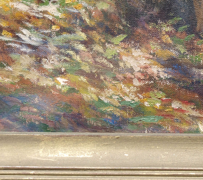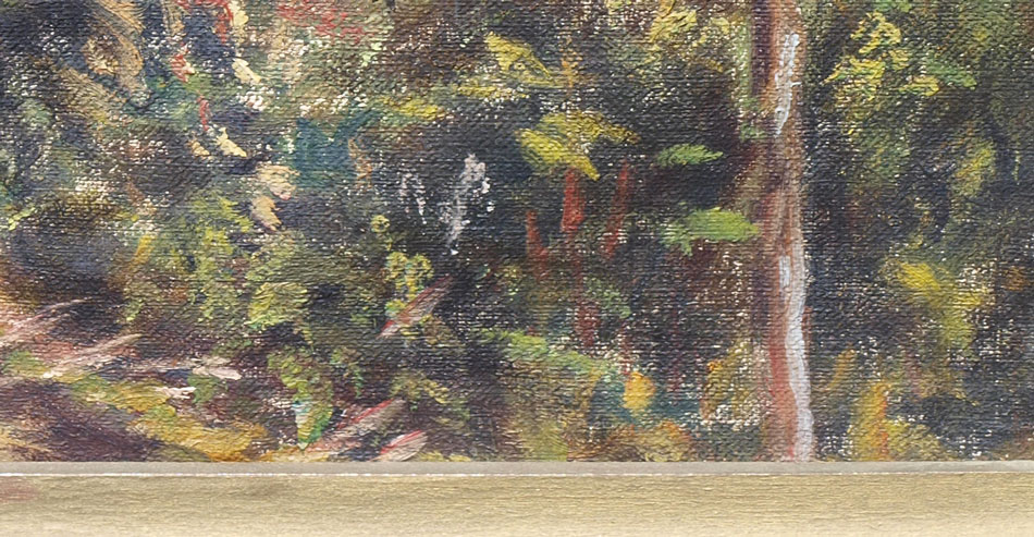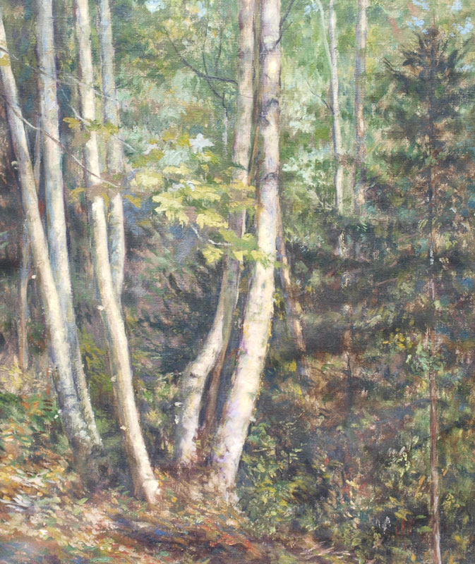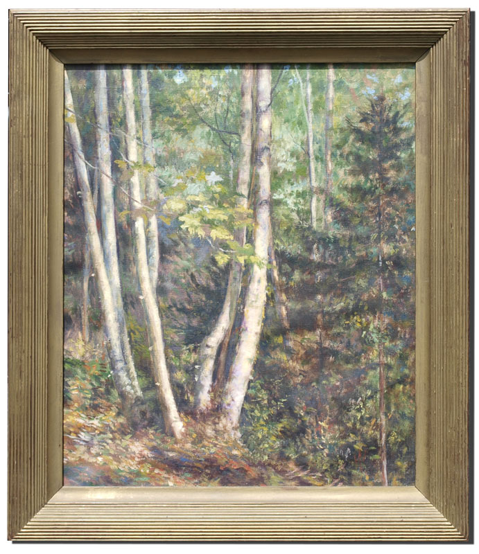 AMERICAN IMPRESSIONIST PAINTING OF BIRCHES AND FOREST: Oil/Canvas, 24'' x 20'', no visible signature, period frame with wear, 29'' x 25, label verso with attribution to Mary Titcomb.