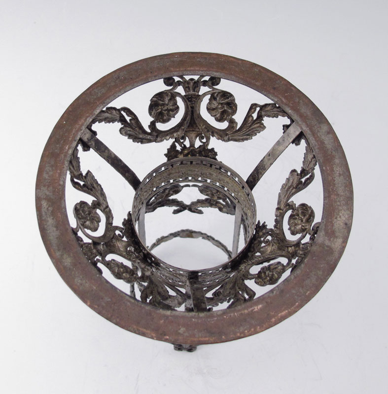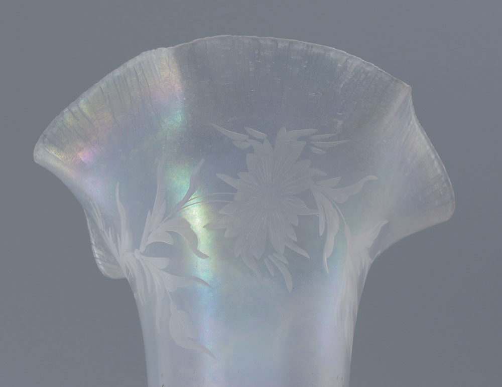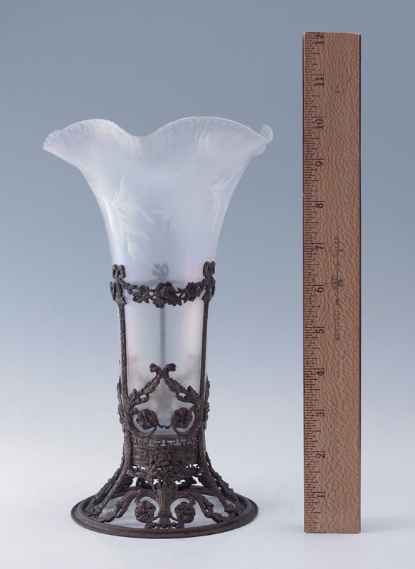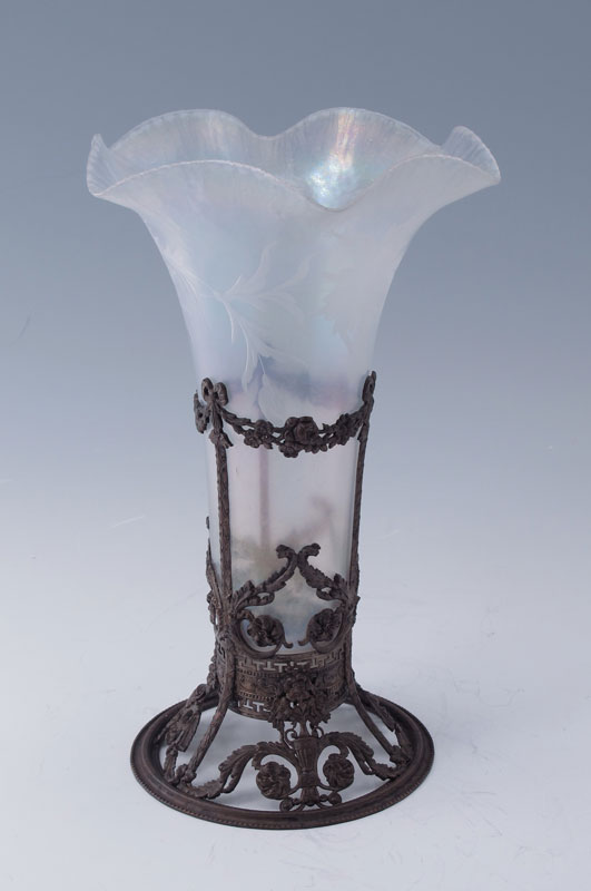 IRIDESCENT ETCHED GLASS MOUNTED VASE: Iridescent vase with etched floral design. Ornate metal base with open work filigree urn and floral designs. Overall 10'' h. x 6 1/4''.